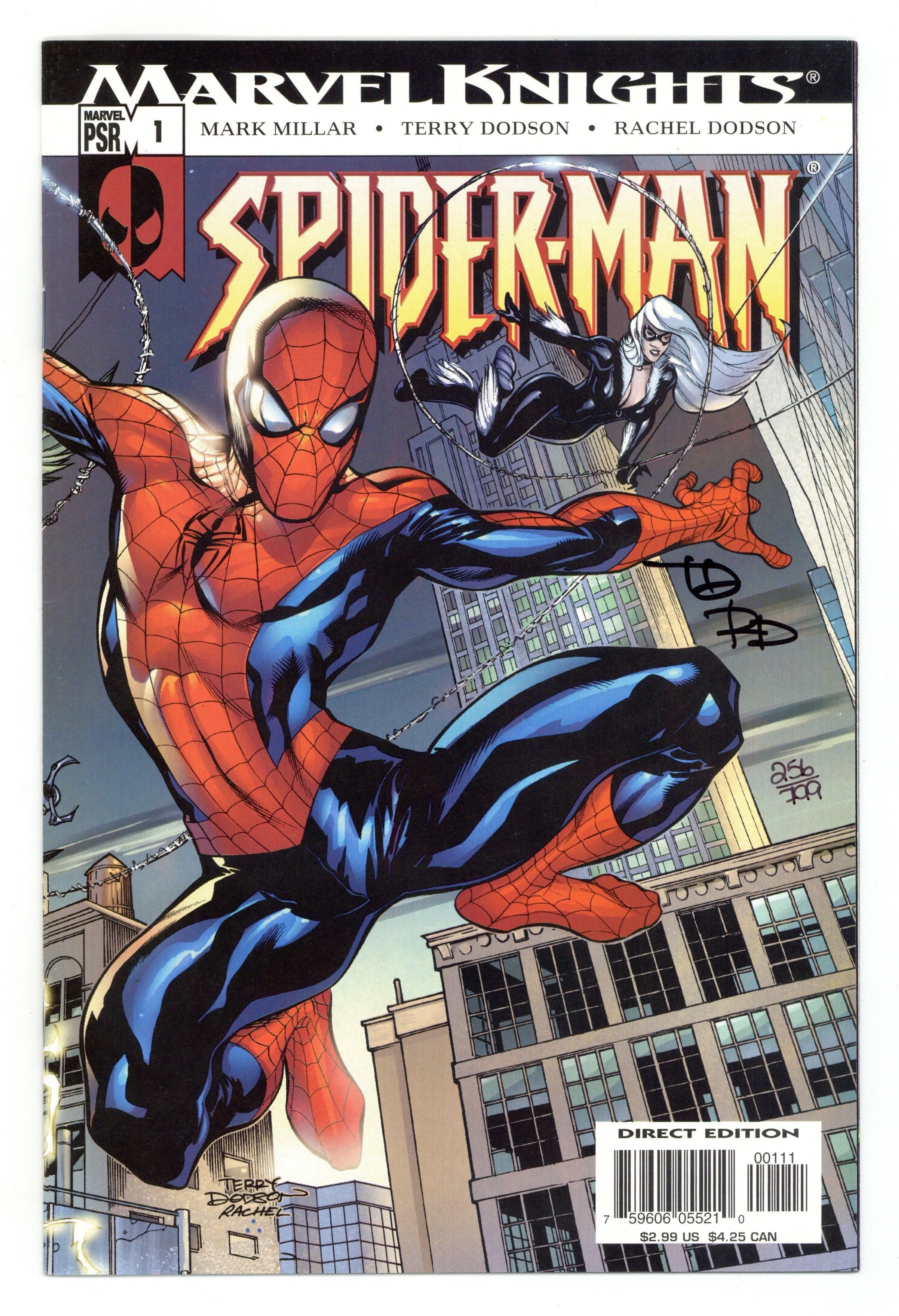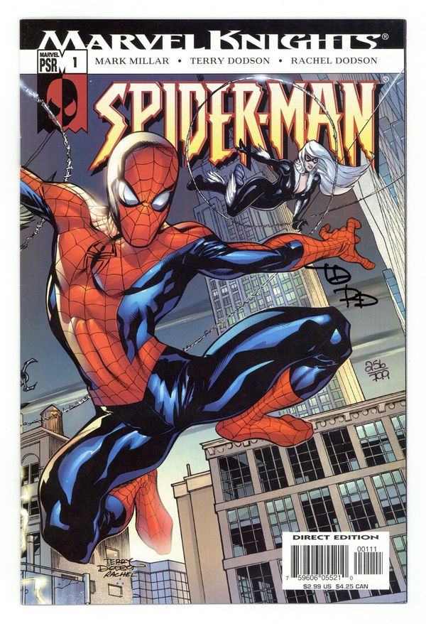 Dynamic Forces edition signed by Terry and Rachel Dodson and limited to 799 copies. Includes certificate of authenticity. Written by MARK MILLAR Covers & pencils by TERRY DODSON Superstars Mark Millar & Terry Dodson team for SPIDER-MAN's debut in an ongoing MARVEL KNIGHTS series. This action-packed, hyper-realistic tale finds Peter Parker forced to face the cruel realities that wearing the Spider-Man mask and web-shooters brings to his personal life. Featuring a brutal confrontation between Spider-Man and the Green Goblin! 32 PGS./MARVEL PSR...$2.99 UPC: 5960605521-00111 ·NEW ONGOING SERIES! ·ONE OF WIZARD's TOP 10 BUZZ EVENTS OF 2004! ·SPIDEY vs. THE GREEN GOBLIN!