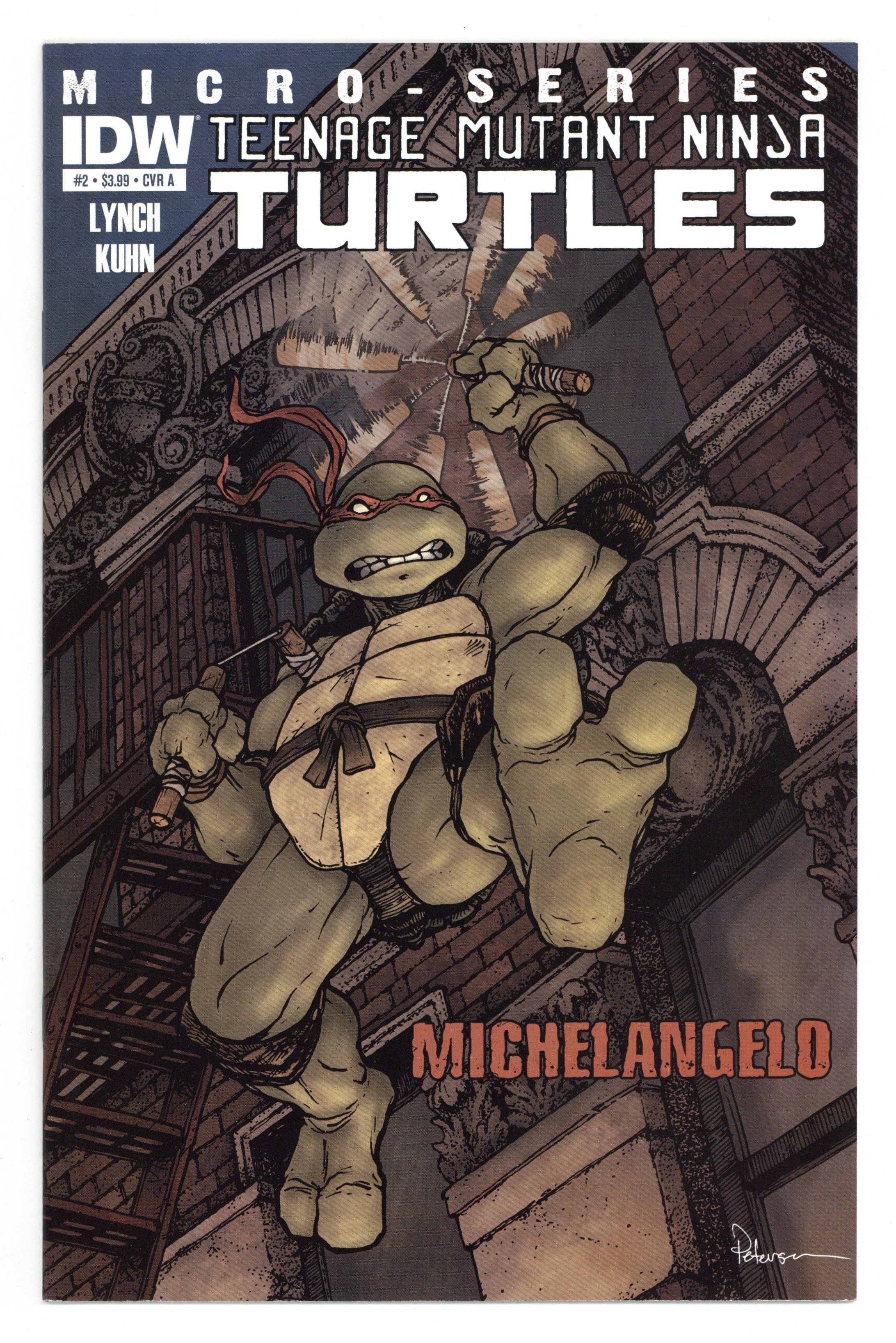 Cover A by David Petersen. Brian Lynch (w) Andy Kuhn (a) The TMNT Microseries continue with everyone's favorite fun-loving Turtle, Michelangelo! Considered by many to be the 'soul' of the Turtles brothers, this story will follow a stand-alone adventure with Michelangelo exploring New York City on his own during the holidays. He'll find new a new friend, grave danger, and uncover new secrets that reveal clues to ongoing mysteries... all with that classic Michelangelo attitude. Don't miss this special issue! Cover price $3.99.