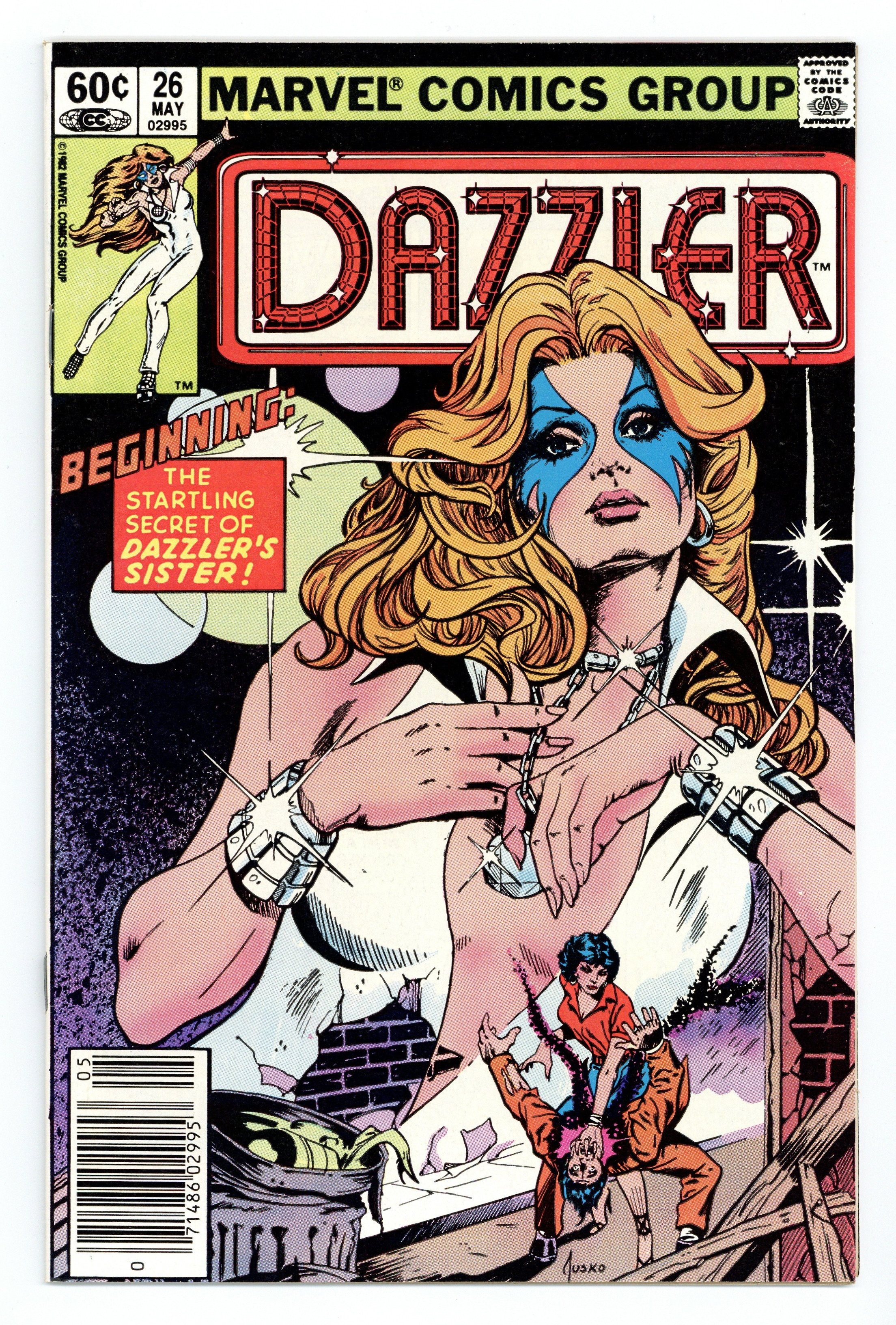 Mark Jeweler Advertisement Insert Variant. Dazzler's half-sister Lois London is accosted by a derelict...and that's when her mutant power manifests in "Against the Wind." Peter Gyrich cameo. Script by Danny Fingeroth, pencils by Frank Springer, inks by Vince Colletta. Cover by Joe Jusko. Cover price $0.60.