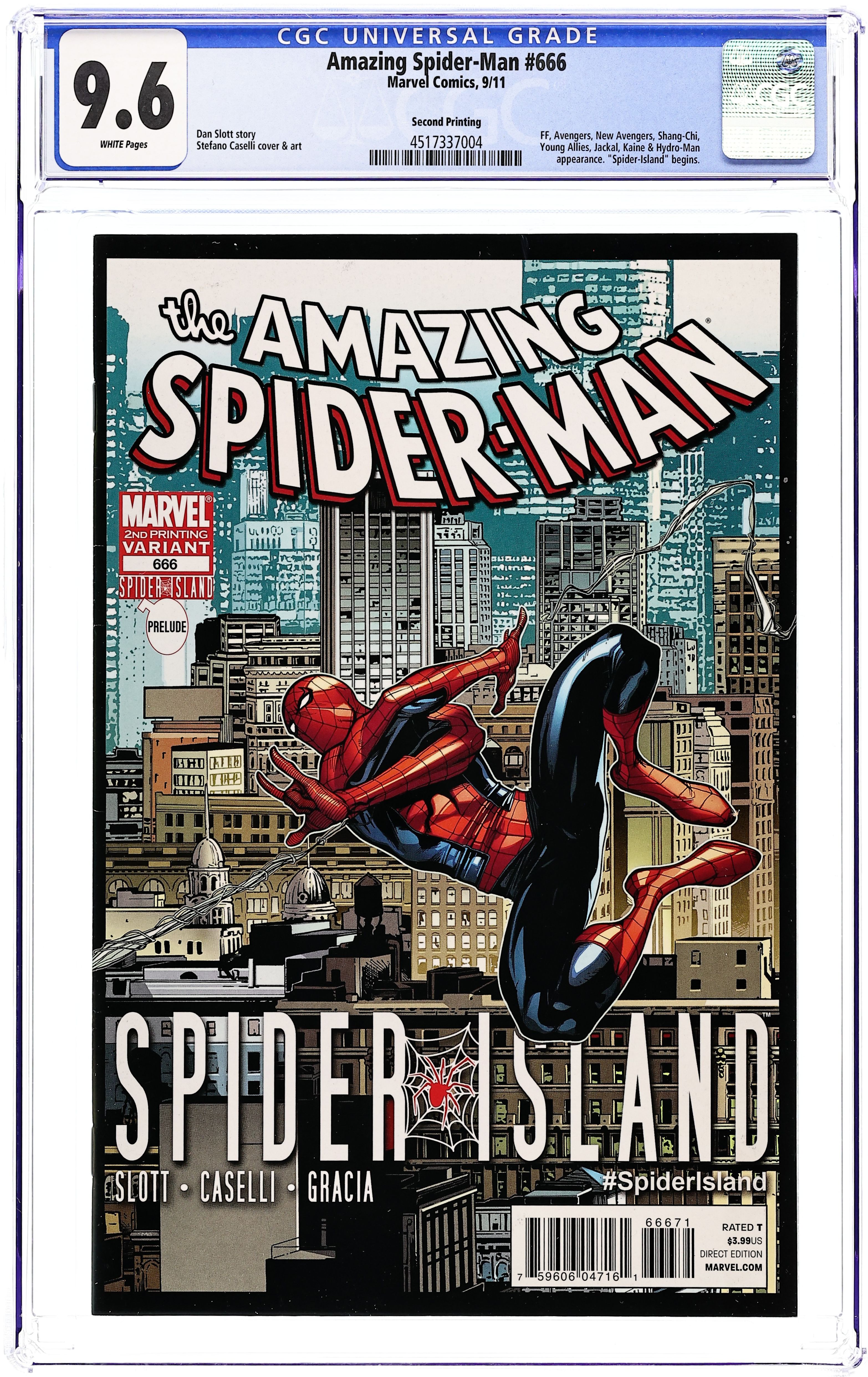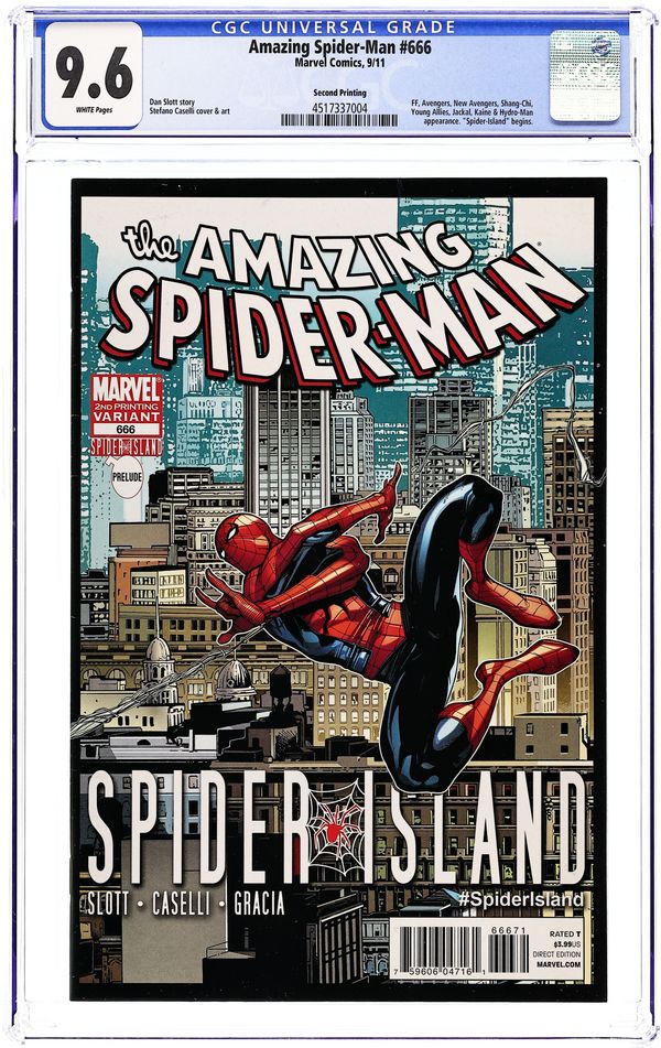 Second Printing Variant Cover. Spider-Island: Prelude - Written by DAN SLOTT. Art and Cover by STEFANO CASELLI. THE SPIDER-MAN STORY OF THE DECADE BEGINS WITH THS 'SPIDER-ISLAND: PRELUDE' Super-star writer Dan Slott and fan-favorite Spidey artist Stefano Caselli are back! New York has been INFESTED, and the web grows as it gets ready to explode into SPIDER-ISLAND! Normal people are getting Spider-Powers! But not all of them realize that with great power must also come ....you know the rest. Okay, sure we often say Peter Parker's life will never be the same. But listen, pal, we've never been more serious. Heroes and villains are crawling all over Manhattan and no one knows why. This will change everything for Pete, for Spidey...and possibly for YOU! Look at it this way...If EVERYONE'S a Spider-Man... then no one is. 44 pgs. Cover price $3.99.