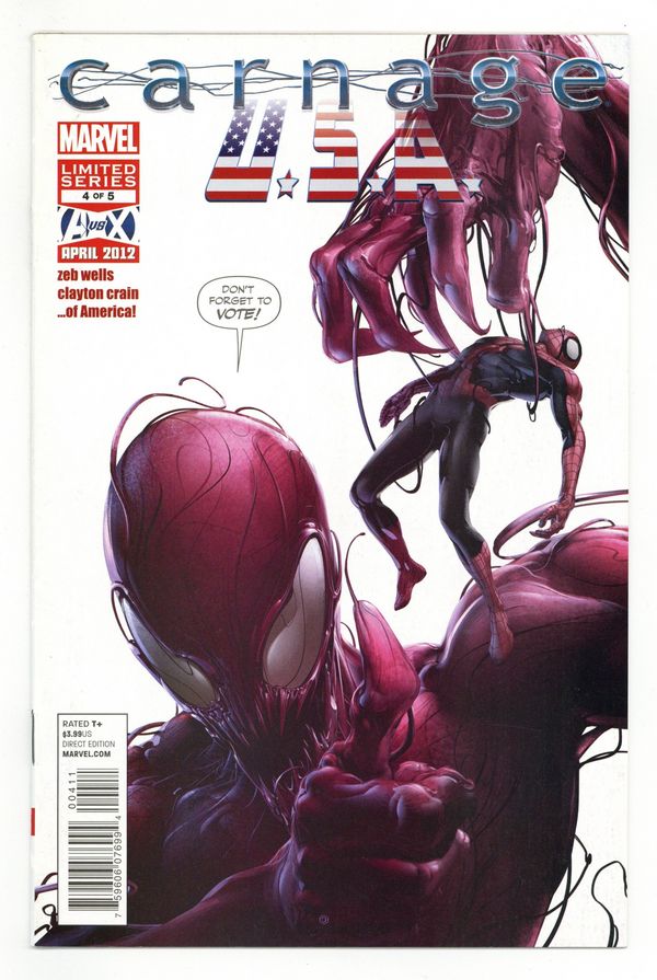 Tags: Spider-Man$8.00(W) Zeb Wells (A/CA) Clayton Crain Zeb Wells (W) Clayton Crain (A/C) Venom Enters Carnage, U.S.A.! Carnage Has Spider-Man On The Run And The Avengers In His Thrall - It Was Only A Matter Of Time Before Flash Thompson Entered The Symbiote-Fray! The Penultimate Portion Of Carnage's Pain-Inducing Plot Proceeds! 32 Pgs./Rated T+ ...$3.99 Cover price $3.99.