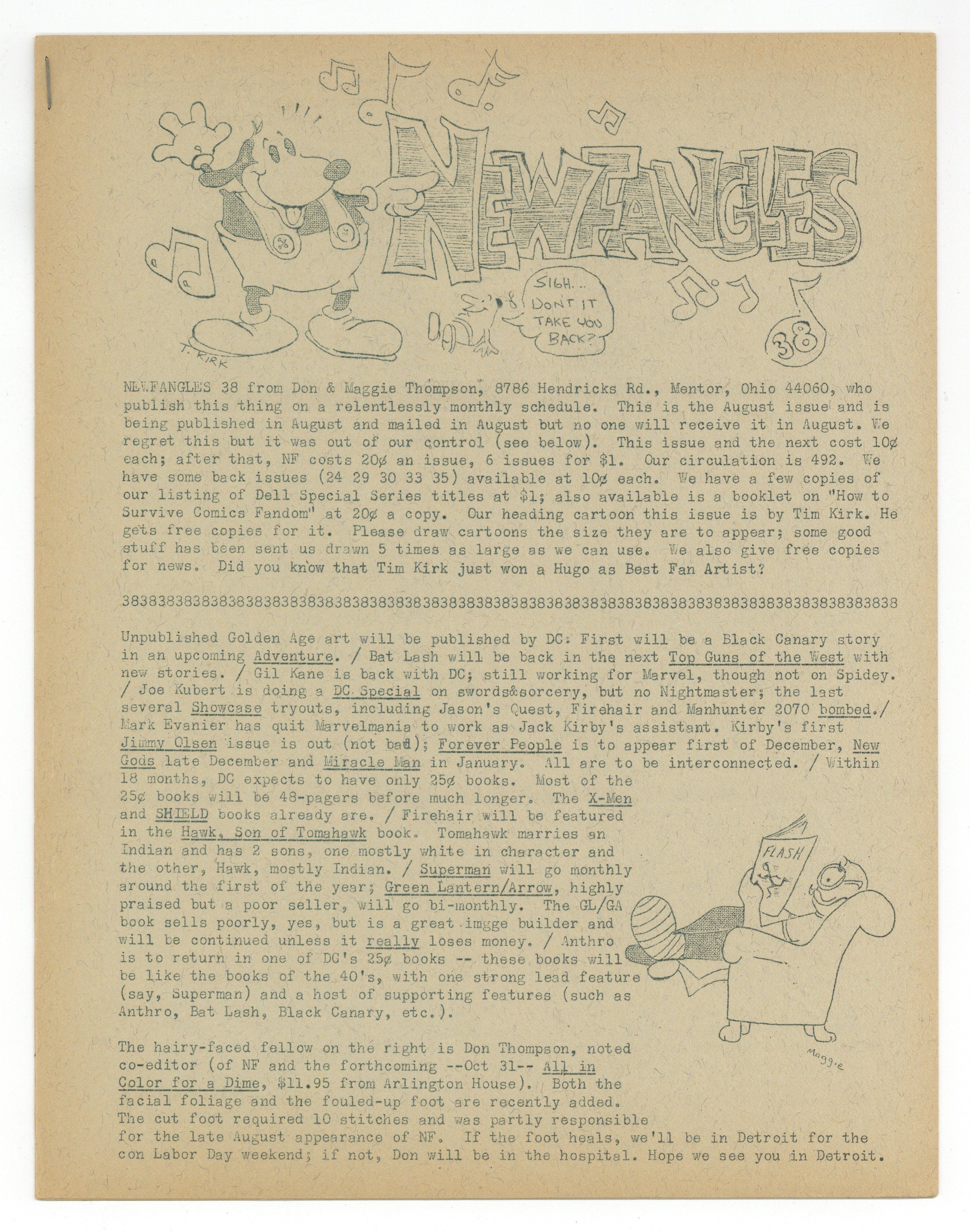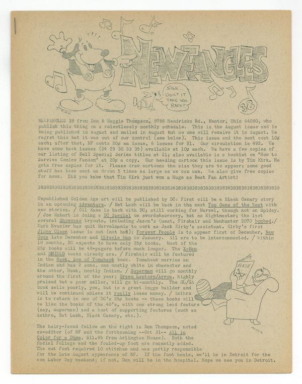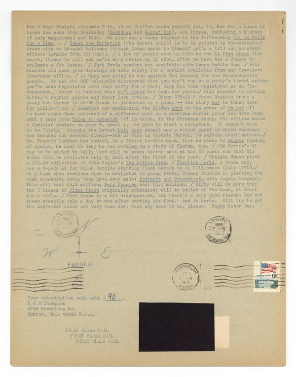 Published Aug 1970 by Don and Maggie Thompson.$45.00News zine published by Don and Maggie Thompson. This issue includes reviews of All In Color For A Dime, The Steranko History of the Comics, and more. 8 pages. Circulation 492. Cover price $0.10.