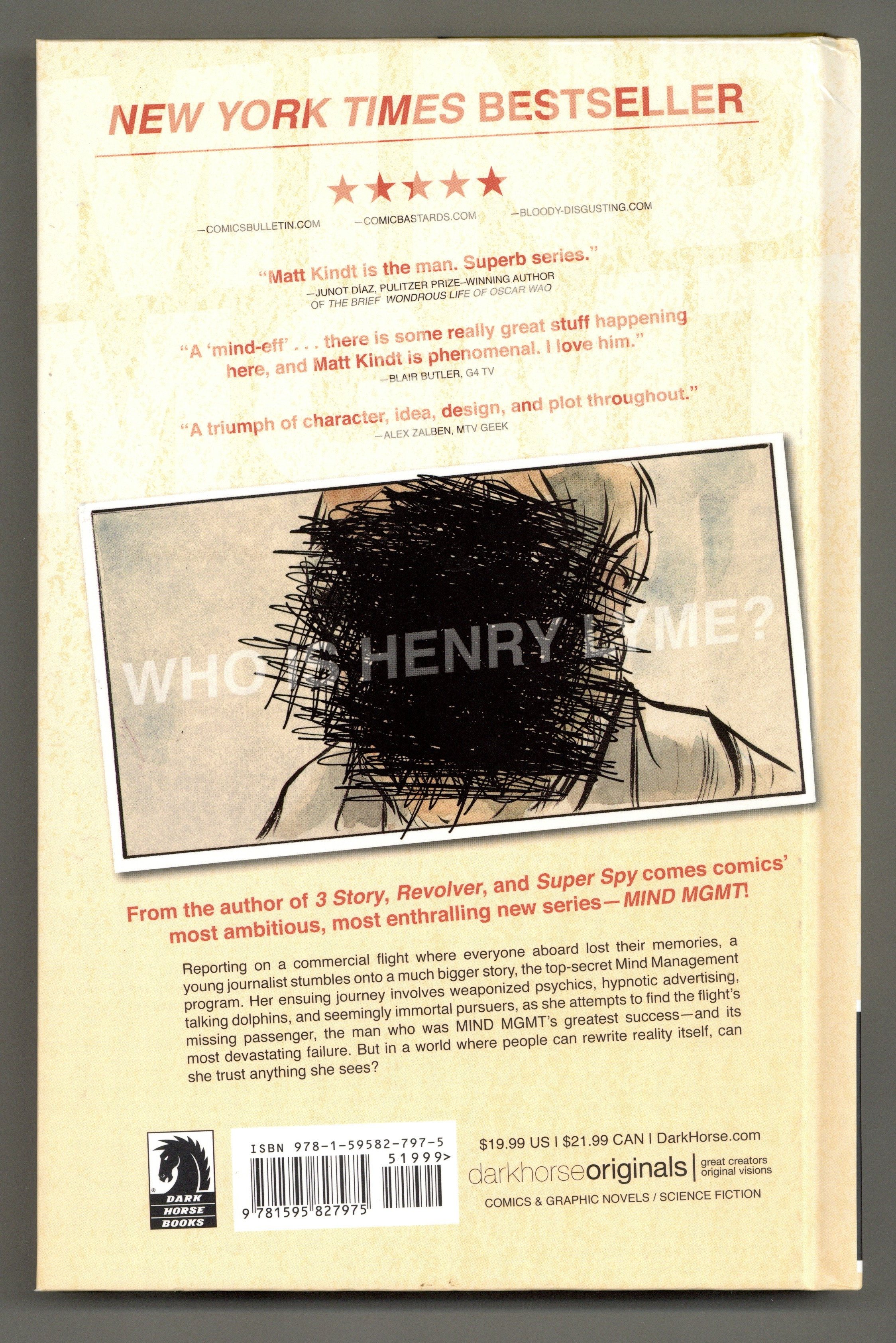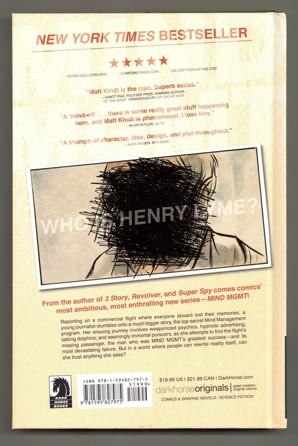 Reporting on a commercial flight where everyone aboard lost their memories, a young journalist stumbles onto a much bigger story, the top-secret Mind Management program. Her ensuing journey involves weaponized psychics, hypnotic advertising, talking dolphins, and seemingly immortal pursuers, as she attempts to find the flight's missing passenger, the man who was MIND MGMT's greatest success-and its most devastating failure. But in a world where people can rewrite reality itself, can she trust anything she sees?
