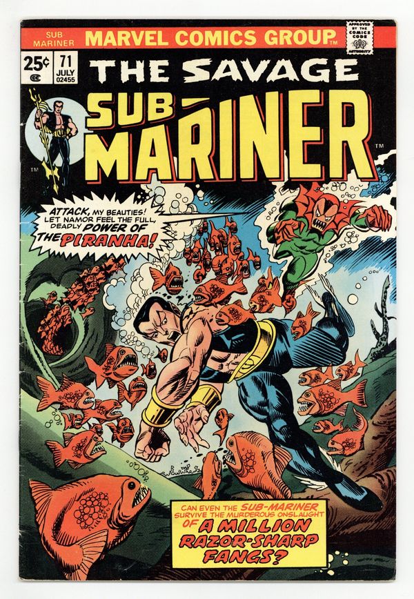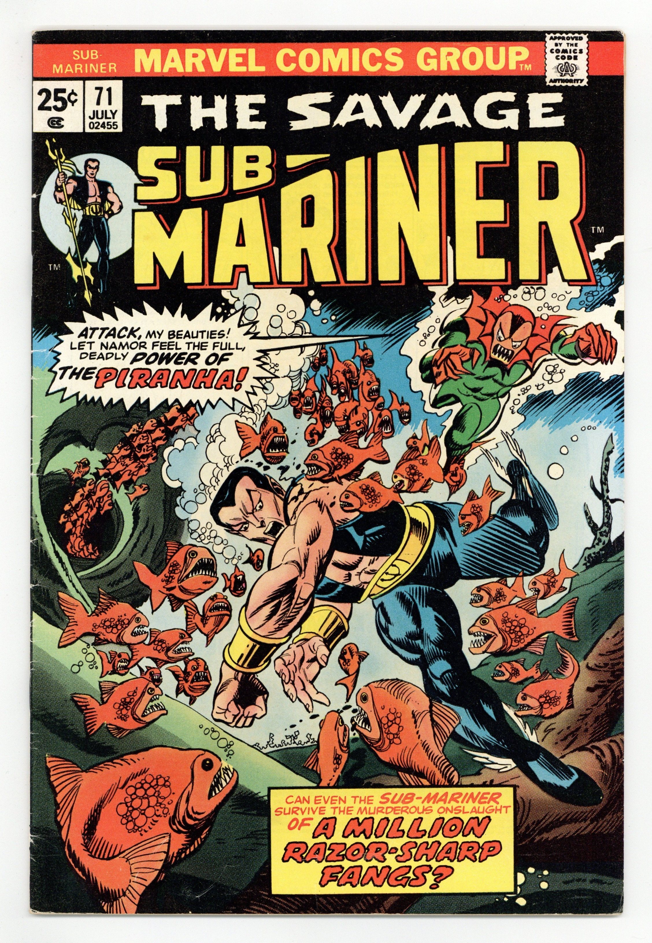 Tags: Sub-Mariner$18.00Mark Jeweler Advertisement Insert Variant. Gil Kane cover. First 25c cover-priced issue. Pirahna attacks in "Comes the Pirahna!" Script by Marv Wolfman, pencils by George Tuska, inks by Vince Colletta. The letters page contains Marvel Value Stamp series A #52 (Quicksilver by John Buscema). Gil Kane cover pencils. Cover price $0.25.