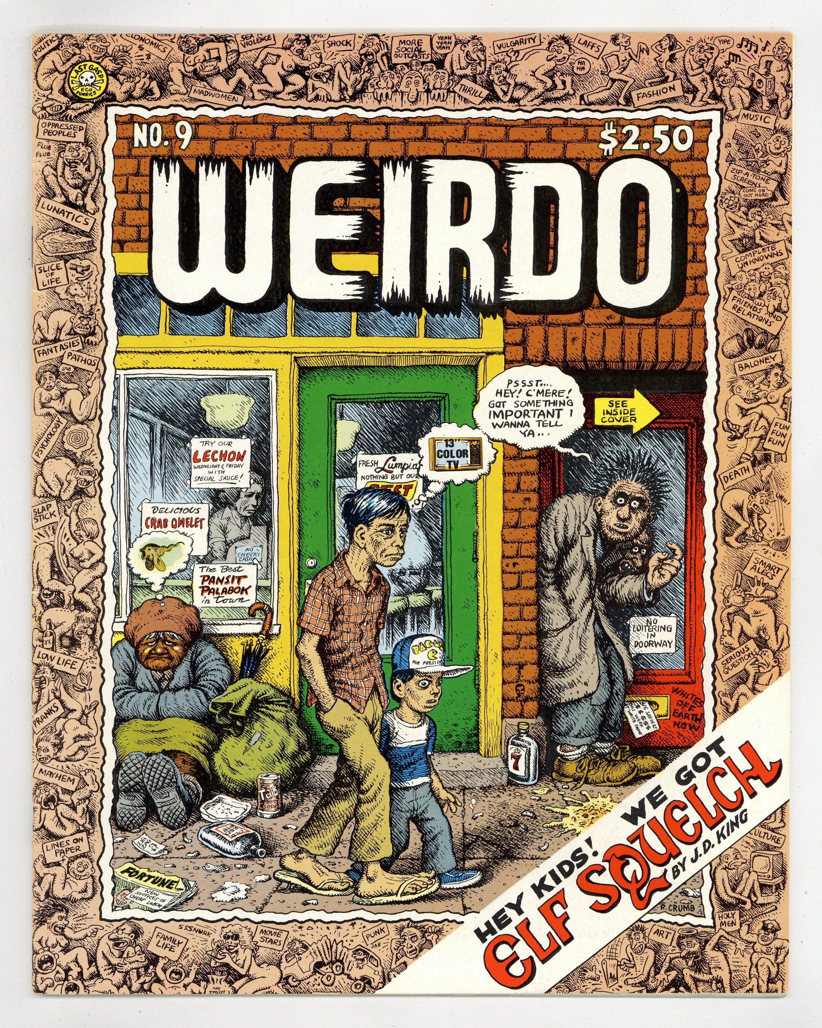 Cover by Robert Crumb. "Elf Squelch," script by Jane King and J.D. King, art by J.D. King; a parody of ElfQuest. "Arline 'n' Bob and That Thing In the Bedroom," script and art by Robert Crumb and Aline Kominsky-Crumb; The trials of having an infant child. "Mission Nites," script and art by Spain Rodriguez; Big Bitch is on Trashman's trail. "Cockroach Crisis," script and art by B.N. Duncan; Hannah ponders the sanctity of life. Six illustrations by Max Crumb. "I Married A Jerk," script and art by Peter Bagge; The faults of a geek husband. "The Artist Meets a Swinger or... Crabs Eating Raoul," script and art by Dori Seda; Dori's experience with swingers. "Cave Nudes," script and art by John Kricfalusi (as Billy Bunting); Flintstones parody. "Modern Boy," script and art by Dave Geary; The modern boy rails against society. 44 pgs., B&W. 8-in. x 11-in. $2.50. Cover price $2.50.