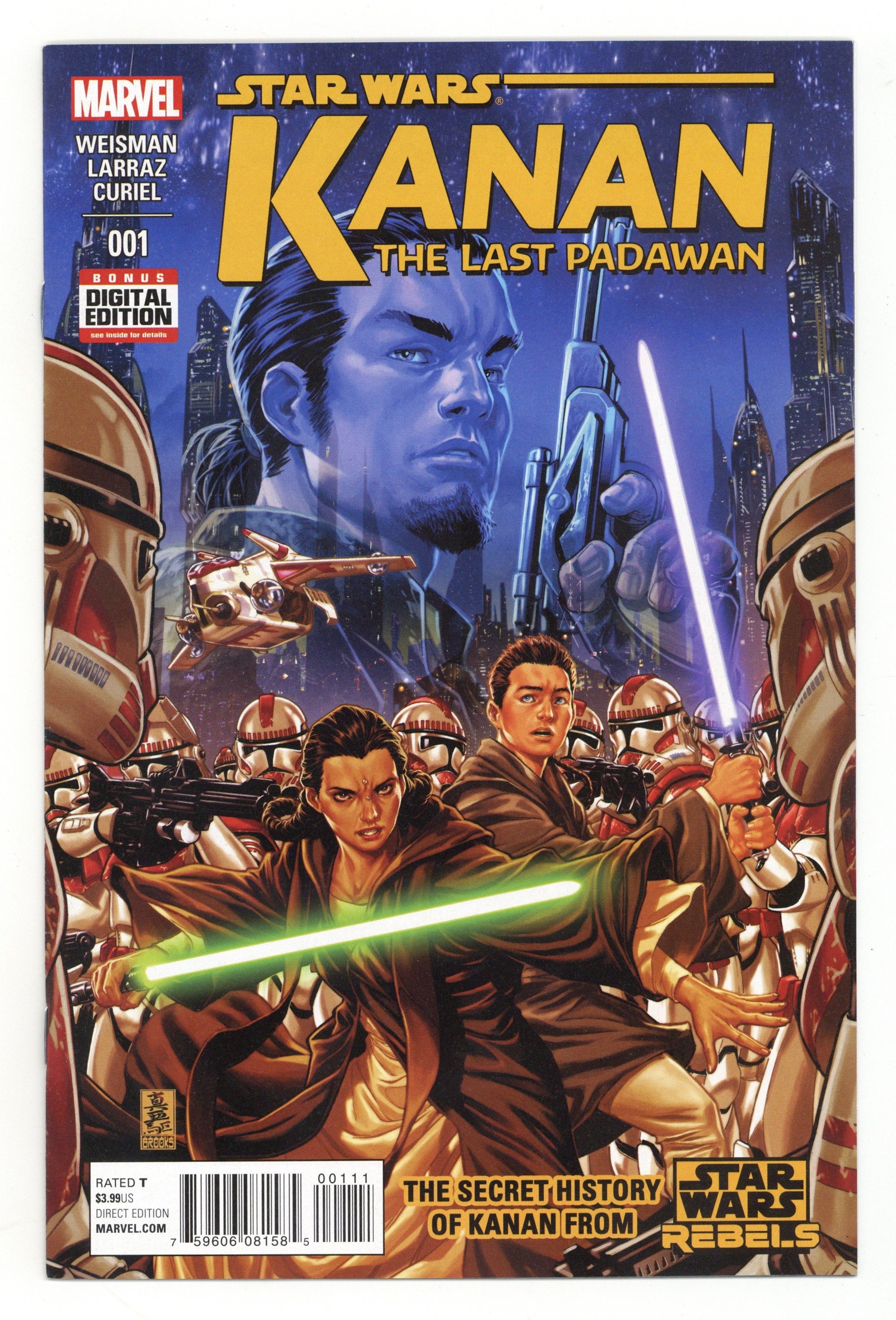 Written by Greg Weisman. Art by Pepe Larraz. Cover by Mark Brooks. Kanan Jarrus--in STAR WARS REBELS, he's a cocky, sarcastic renegade fighting against the Galactic Empire alongside the rag-tag crew of the Ghost...but years before, at the height of the Clone Wars, he was known as Caleb Dume, Jedi Padawan under the instruction of Jedi Master Depa Billaba. Neither master nor apprentice ever suspected that the Clone Troopers they commanded would turn on them upon the issuing of Order 66-the order to execute all Jedi. How did Caleb Dume survive? How did he learn to survive on his own? And how did he become the man we know as Kanan Jarrus? A tale bridging the years between the Clone Wars and Rebels! 28 pages, full color. Rated T. Star Wars Lucasfilm Ltd. & TM. All rights reserved. Used under authorization. Text and illustrations for Star Wars are 2015 Lucasfilm Ltd. Cover price $3.99.
