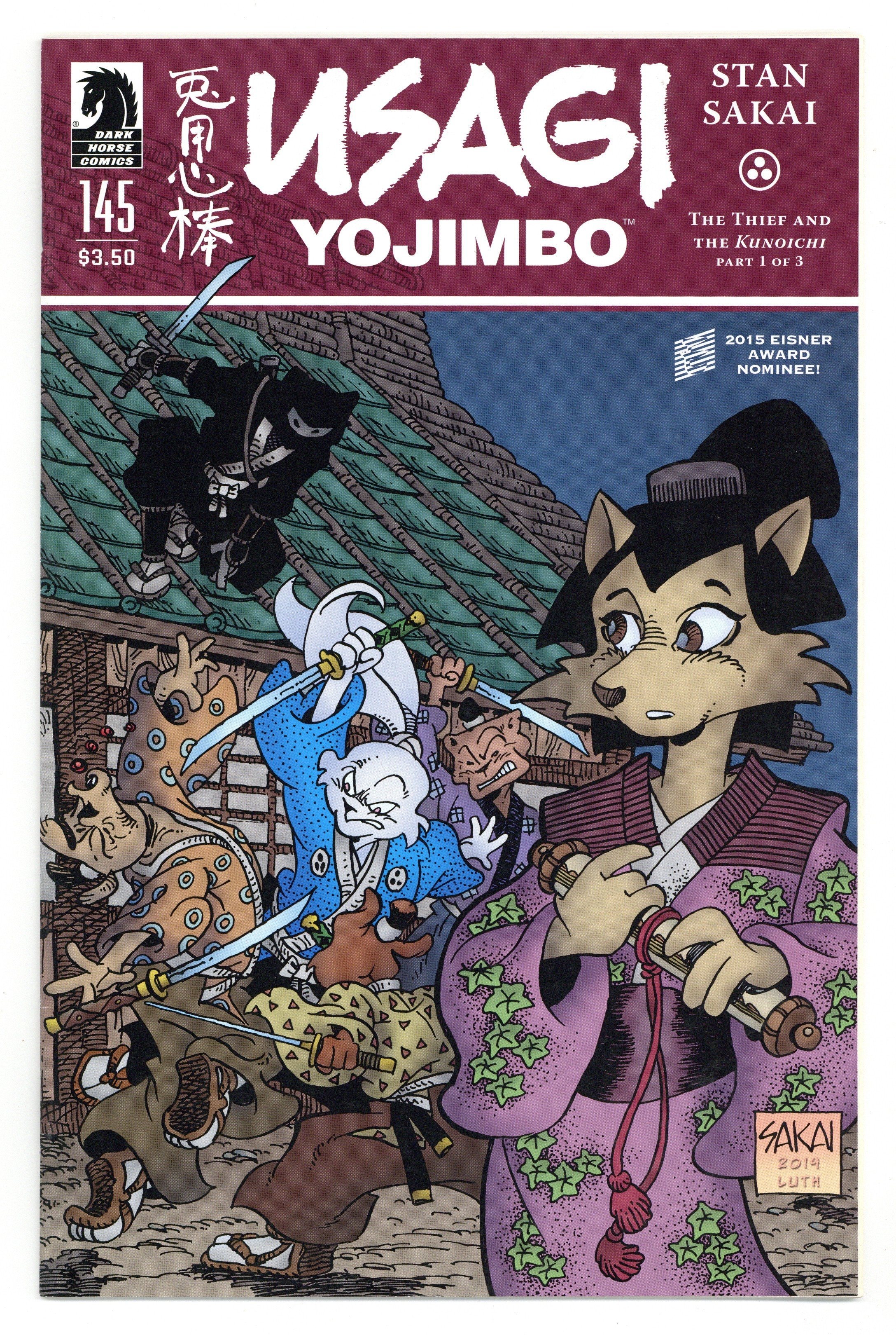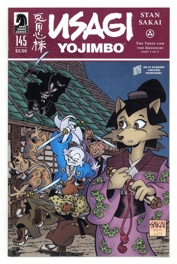Tags: Martial ArtsPublished May 2015 by Dark Horse.$11.25Story, Art and Cover by Stan Sakai. Stan Sakai triumphantly returns to his signature creation, just in time for Usagi to find himself caught up in a fight between his thief friend Kitsune and a ninja intent on getting the mysterious scroll Kitsune has stolen, at any cost! 24 pages, B&W. Cover price $3.50.