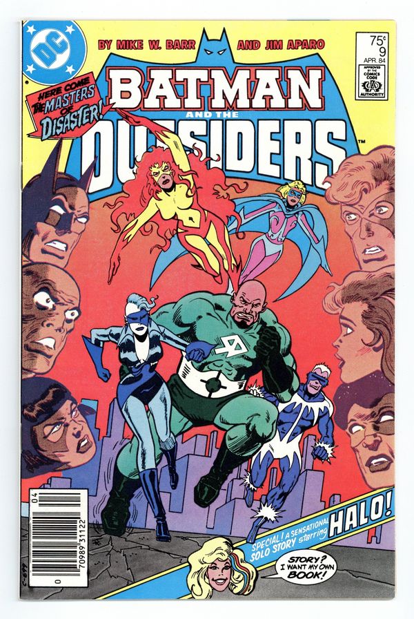 $32.00Mark Jeweler Advertisement Insert Variant. The Masters of Disaster try to flush out Black Lightning in "Enter: The Masters of Disaster!" Part 1 of 2, continued next issue. Script by Mike W. Barr, art by Jim Aparo. Back-up tale: Halo stars in "Battle For The Band!" Script by Mike W. Barr, pencils by Bill Willingham, inks by Mike DeCarlo. Aparo cover. Cover price $0.75.