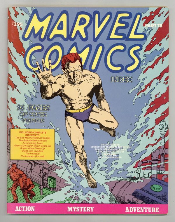 Magazine series devoted to indexing Marvel Comics Series with synopsis of each title, and info (picture of cover, date, story title, art & writing credits, character appearances and other comments) on each issue of the series. Also Includes a list of crossover appearances. THIS ISSUE covers Heroes from Tales to Astonish Book 2. Bill Everett/Dean Motter cover. Synopsis of Sub-Mariner (original 1940's series). Notes on The Marvel Mystery Comics #s 4,10 & 82. Sub-Mariner Comics #s 1-42, Namora # 1-3. Sub-Mariner (1968) # 1-72, & annuals # 1-2. Astonishing Tales # 1-36. Giant Size Super-Villian Team-Up # 1-2, & Super Villian Team-Up # 1-14. Giant Size Invaders # 1, Invaders # 1-32, & annual # 1. Personnel & Major Character cross reference indexes. Golden Age cover gallery. Cover price $3.95.