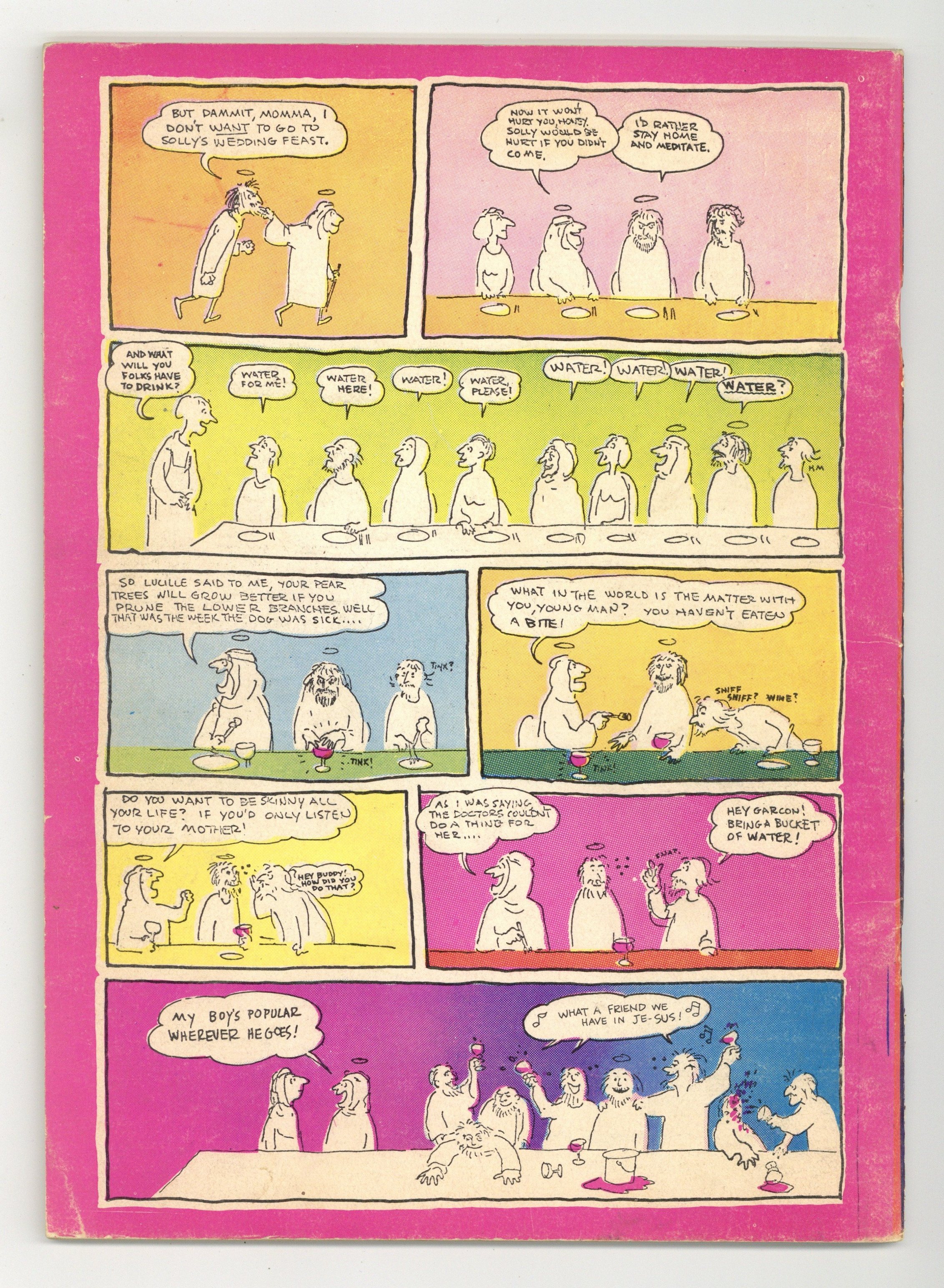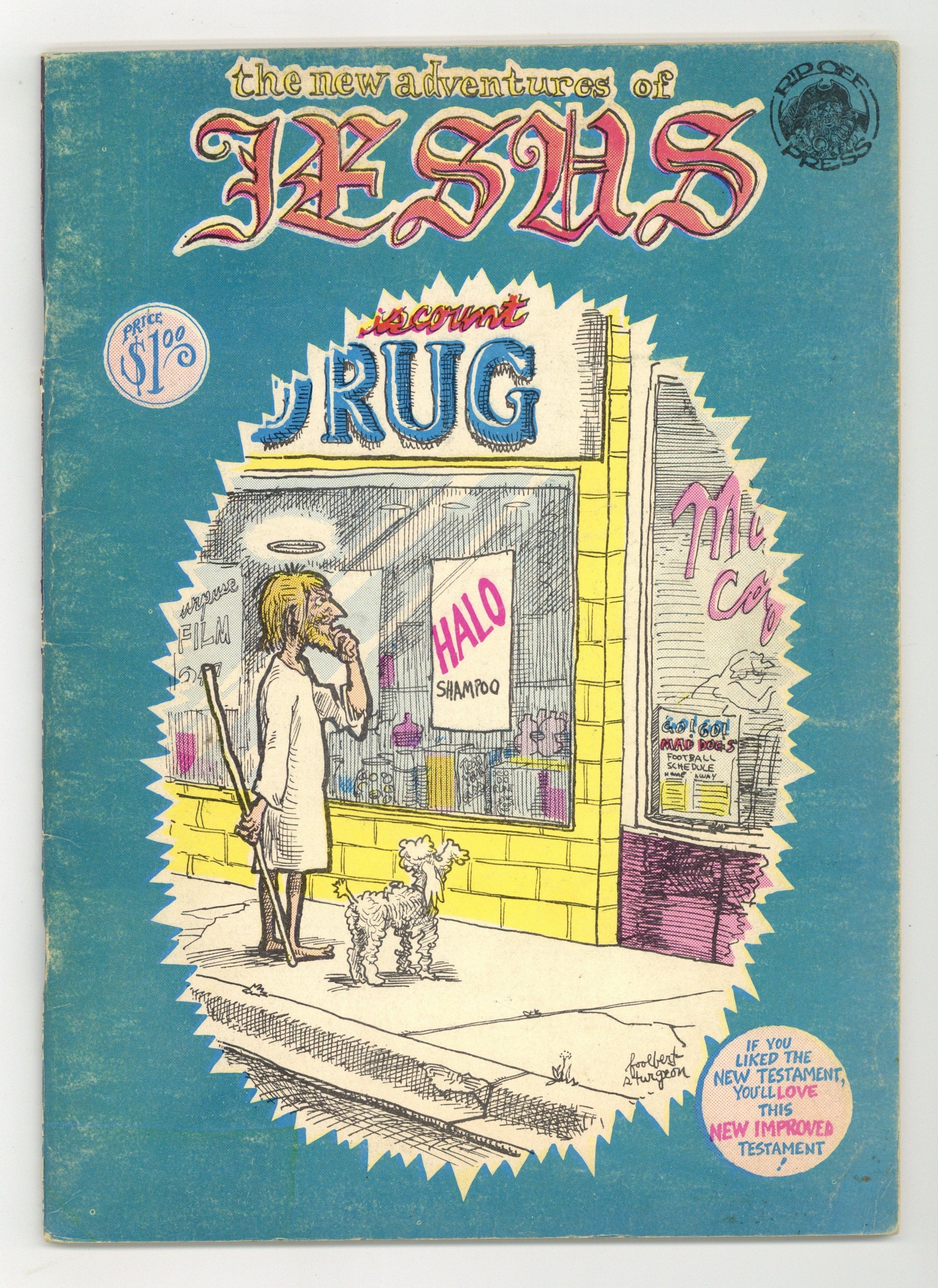 1st printing. Stories and Art by Frank Stack (Foolbert Sturgeon). Follow the Adventures of Jesus in the modern world including Jesus Goes to The Movies, and Jesus' Second Coming! 7-in. x 9 1/2-in., 44 pages, B&W. MATURE READERS. NOTE: 1st Printings are identified by a $1.00 Cover Price, and a BLUE Cover. Cover price $1.00.