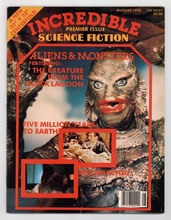 Tags: HORROR MAGAZINESPublished Aug 1978 by Science Fantasy Films Cla.$23.00Incredible Science Fiction features articles and pictures from many Sci-Fi/Horror movies and television shows. This, the premier issue, focuses on aliens and monsters. There is an interview with Kathryn King, a look at the SFX of some of Hollywood's best known horror films, Jeff Sillifant analyzes "Close Encounters of the Third Kind," an in-depth look at the classic Universal Picture "Creature from the Black Lagoon," and much more. One of the first printed ads for Star Wars action figures, the X-Wing Fighter, and Tie Fighter appears on the back cover. 66 pages. Cover price $2.00.
