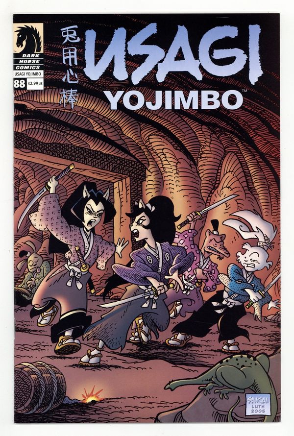 Published Oct 2005 by Dark Horse.$13.00STAN SAKAI (W/A) On sale October 26, b&w, 24pg, $2.99 World-renowned storyteller Stan Sakai treats his readers to an all-out samurai brawl in this issue of Usagi Yojimbo! Fans of the rabbit ronin are well accustomed to Sakai's deft hand with dynamic fight scenes, and this issue gives him plenty to work with?Usagi and Tomoe, captured and forced to work in Lord Sanada's illegal gold mine, lead a slave revolt! But they face Tomoe's murderous cousin, Noriko "the blood princess," and with her a horde of Sanada's deadly samurai. To make matters worse, the slaves only have shovels and hoes in their battle against lethal steel swords! And in the ensuing chaos, someone will be trapped inside the mine ... find out who in part six of "The Treasure of the Mother of Mountains"! Cover price $2.99.