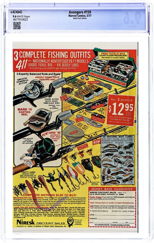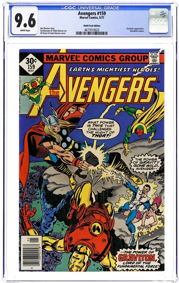 Whitman Variant. "Siege by Stealth and Storm! Part 2 of 2. Script by Jim Shooter. Art by Sal Buscema (breakdowns) and Pablo Marcos (finishes). Cover by Gil Kane and Frank Giacoia. The Avengers' assault on Graviton's airborne city has failed! And now the super-villain who can control gravity moves his floating city over the island of Manhattan! With eight avengers as prisoners, Graviton's plan to blackmail New York looks unstoppable! But dramatically two more avengers arrive on the scene! Can Thor and the Black Panther lift the Avengers to victory? Cameo appearance by Daredevil. (Notes: Graviton appears next in Marvel Two-in-One Annual 4. The first subplot of the Korvac Saga begins in this issue.) Cover price $0.30.