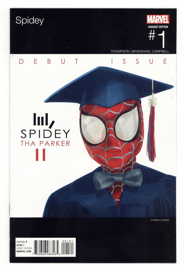Hip Hop Variant Cover by Gyimah Gariba. Written by Robbie Thompson. Art by Nick Bradshaw. Think you know everything about Peter Parker's early days? Think again. It's action, adventure and a rip-roaring romp in classic Marvel style as SPIDEY swings onto shelves this winter! Featuring adventures from throughout the web-slinging wonder's younger years, it's a return to the days of overdue homework, not knowing how to talk to girls (or anybody, really) and just a plenty of danger. Witness some of Spidey's earliest tangles with the likes of DOC OCK, SANDMAN and a host of other unexpected guests! 28 pages, full color. Rated T Cover price $3.99.