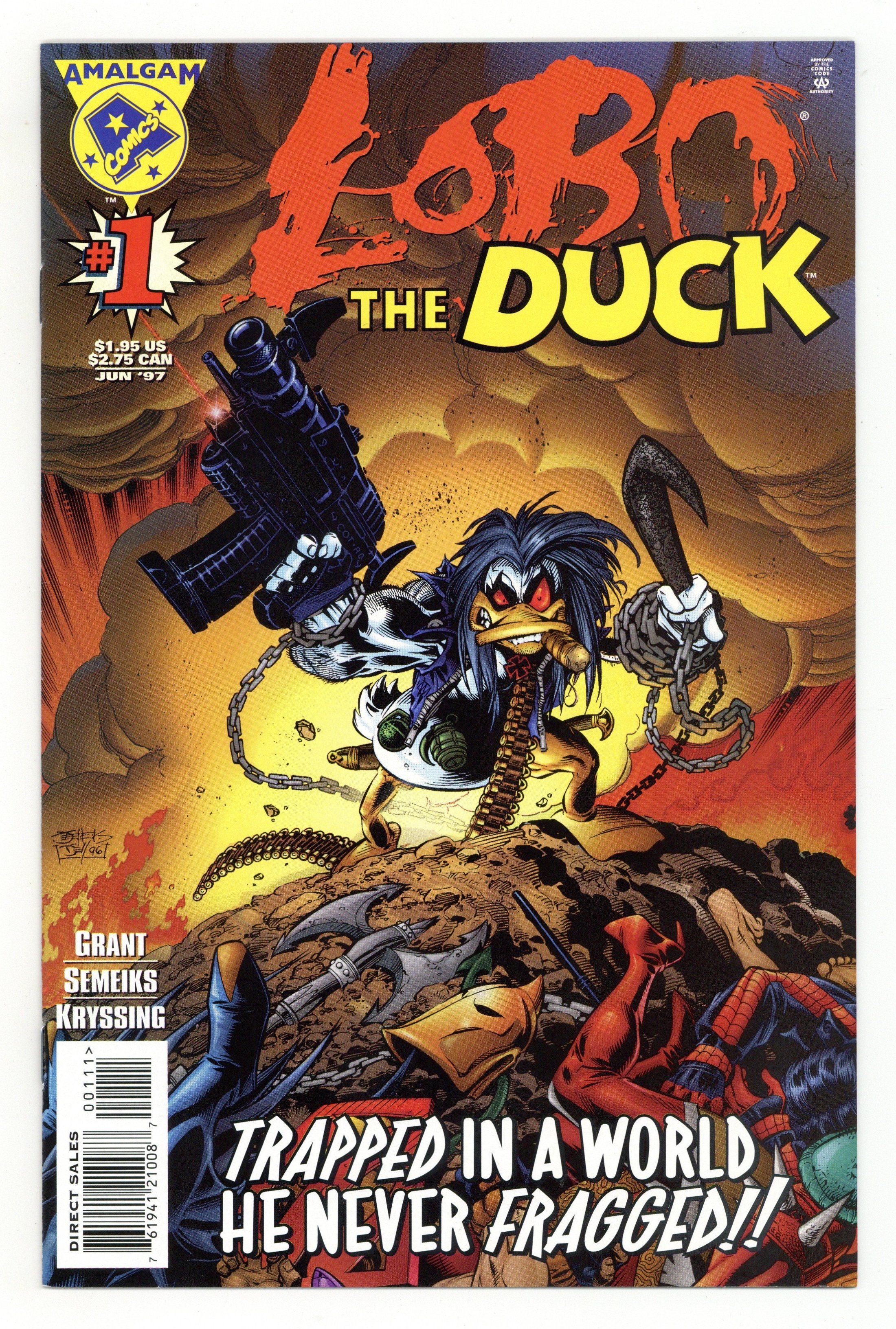 "Fraggin' Wauugh!" Story by Alan Grant. Art by Val Semeiks and Ray Kryssing. In order to save two universes, the young hero known as Access was forced to use the power of Amalgam (see Marvel versus DC (1996) #3). In this issue, the Master of Quack-Fu, Howard the Duck, and the Main Man, Lobo, are merged to create Lobo the Duck. The world is in ruins and all of Earth's heroes are dead and gone. In this post-apocalyptic landscape only the creature known as Lobo the Duck can thrive. Cover price $1.95.