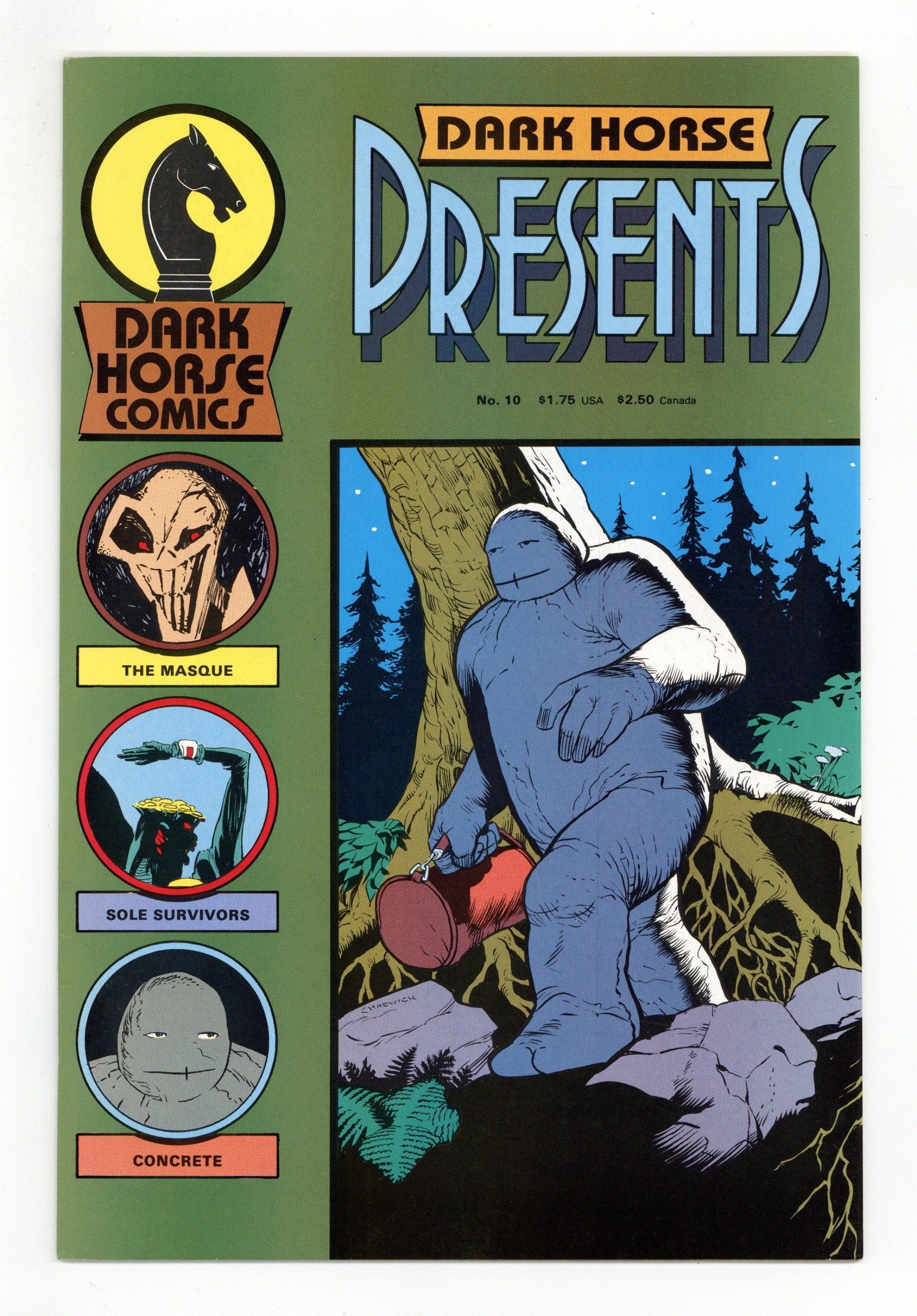 An anthology of original stories. Cover by Paul Chadwick. Straight in the Eye, script and art by Paul Chadwick; Concrete has agreed to help a man look for his lost brother who's last location was in the woods; The man's brother (Adam) is a stuntman who often takes enough fuel to fly and sleeps under the wing of his biplane. Masque (Part 1), script and art by Mark Badger; Two men arguing in a church in Manhattan about a man named Montoya; Cut to Newark airport where a group of what are assumed F.B.I agents are trying to find Montoya, after some squabbling he is apprehended but it turns out it's the wrong man; Montoya is then spotted and is chased into a bizarre room; The Masque appears and is subsequently shot. Sole Survivors, script by Randy Stradley, art by Tony Salmons; An Alien takes cover behind a rock and is in a Mexican standoff with another lone alien. 36 pgs., B&W. $1.75. Cover price $1.75.