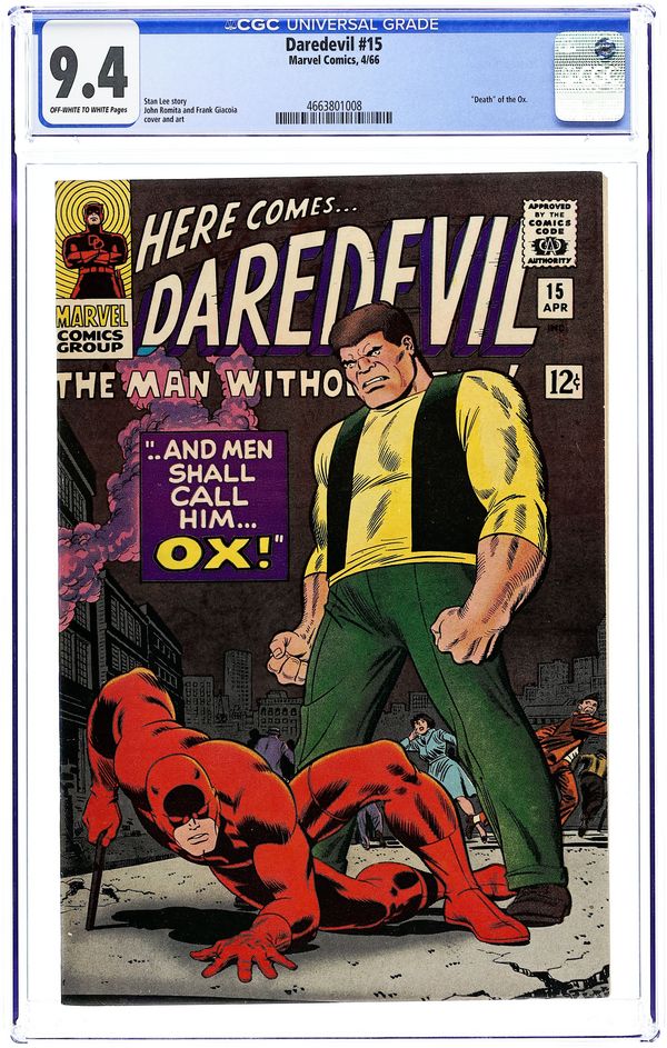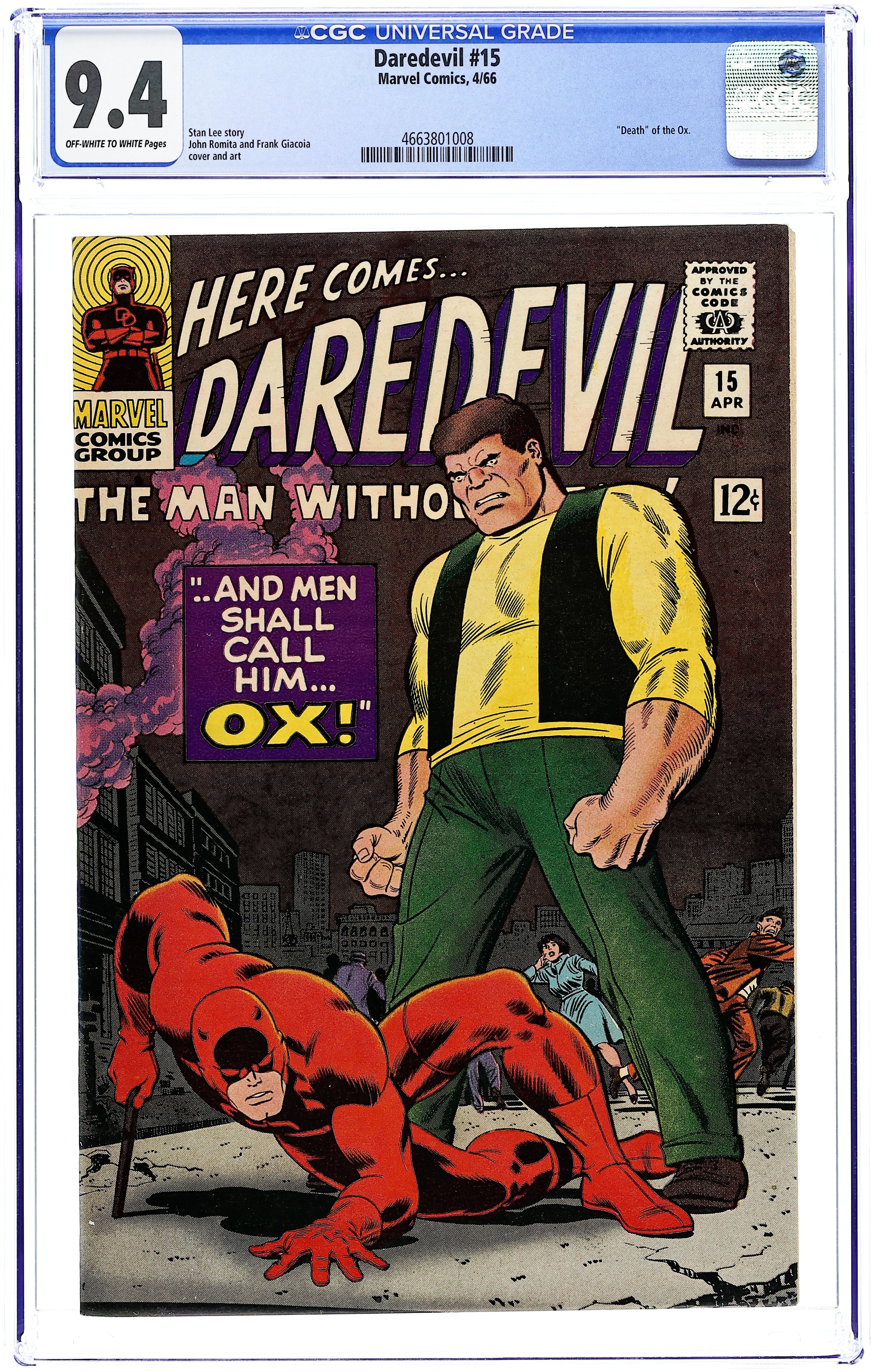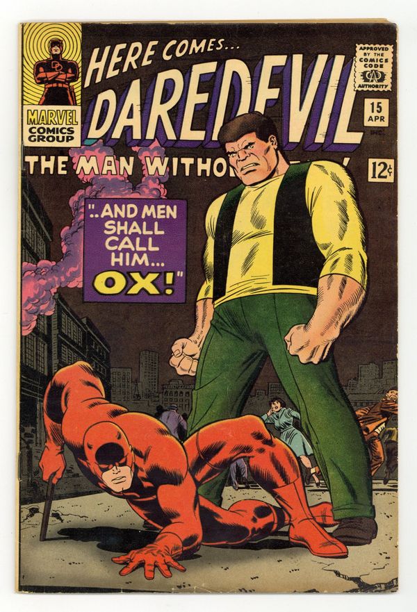 Tags: Marvel Legacy Numbering: Daredevil (part 15), Daredevil$19.00First appearance of the second Ox (Dr. Karl Stragg) in And Men Shall Call Him Ox!, script by Stan Lee, pencils by John Romita, inks by Frank Giacoia; The Ox is convinced by his cellmate, Dr. Karl Stragg, that if the two can escape, the good doctor will make Ox smarter; Stragg double-crosses the Ox and switches bodies with the brute; DD tracks down the new and improved Ox only to defeat him permanently. 36 pgs. Cover price $0.12. Cover price $0.12.