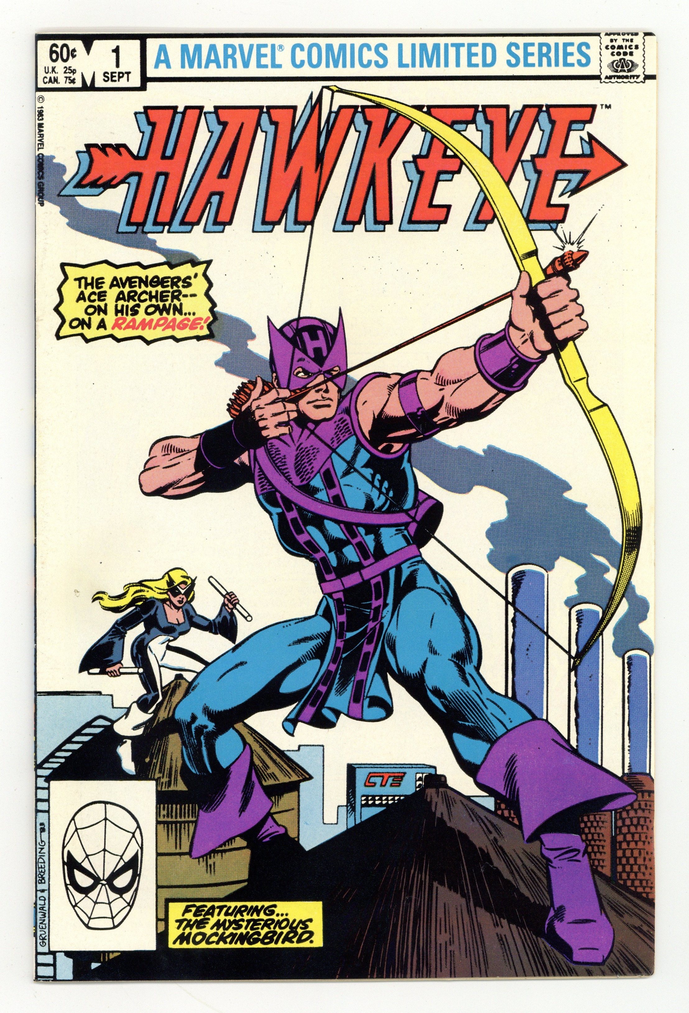 Direct Edition. "Listen to the Mockingbird" Guest-starring Mockingbird. Script by Mark Gruenwald. Art by Mark Gruenwald (pencils) and Brett Breeding (inks & embellishes). Cover by Mark Gruenwald and Brett Breeding. At last the Avengers' ace archer has his own limited series! And at the moment life is great for Clint Barton with a new job, new rocket-sled, and new girlfriend! But a late night encounter with a mysterious woman called Mockingbird turns Hawkeye's dream world upside down! The ex-SHIELD agent tells the bow-slinger that his employer, Cross Technological Enterprises, is involved in criminal activities! But Hawkeye doesn't believe her! However he will... after he's double-crossed by Cross! Retelling of Hawkeye's origin. Flashback cameos by Barney Barton, Iron Man, Captain America, Quicksilver, Scarlet Witch, and the Swordsman. (Notes: Mockingbird previously appeared in Marvel Team-Up 95. This four-part limited series was reprinted in 1988 in the trade paperback: Hawkeye; and again in 2009 in the trade paperback: Avengers Hawkeye.) 32 pages. Cover price $0.60.