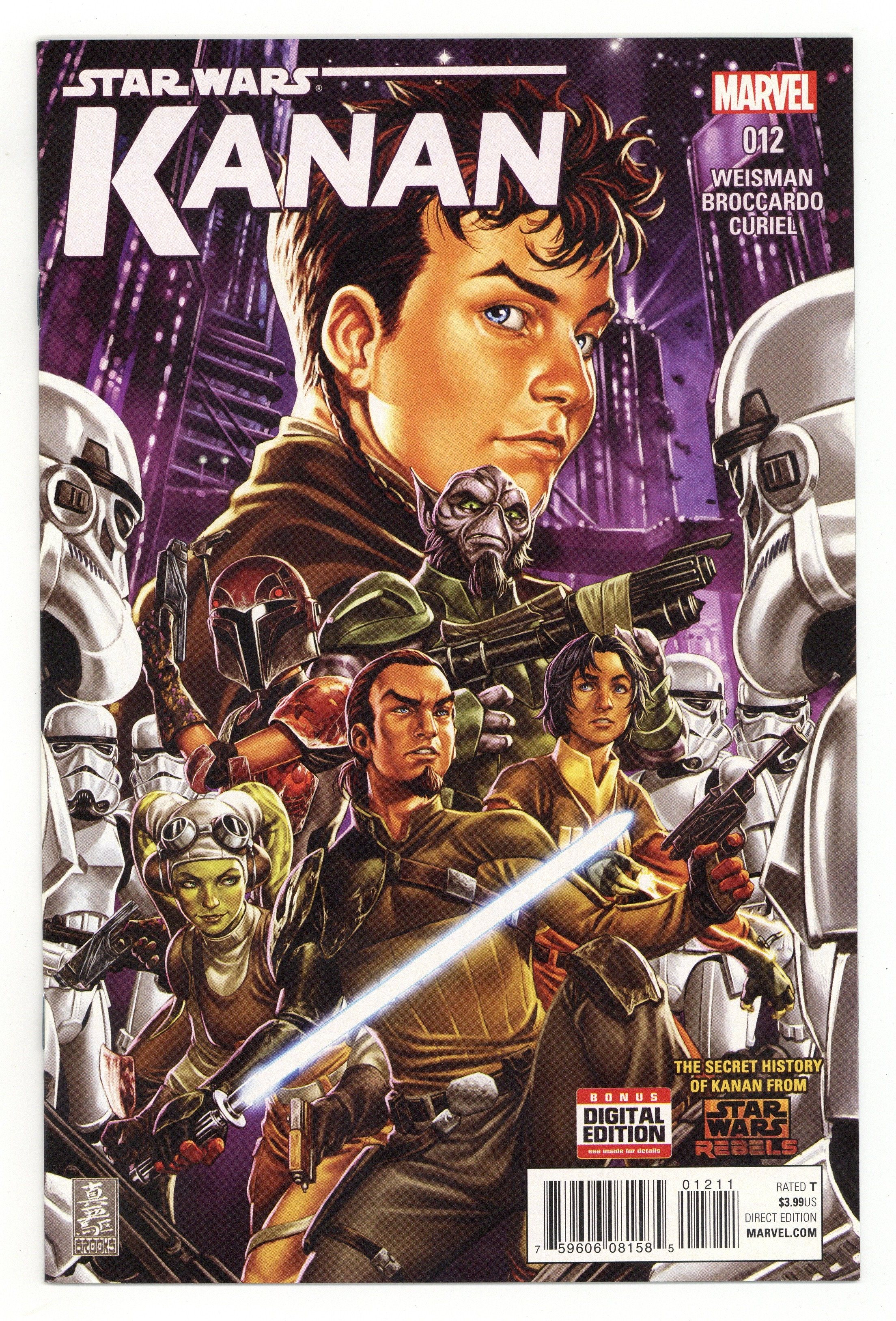 Written by Greg Weisman. Art by Andrea Broccardo. Cover by Mark Brooks. The rebels' adventures on Kaller come to an end! But when a friend from Kanan's past needs help, he stays behind... The look into the past of the former Jedi concludes here! 28 pages, full color. Rated T Cover price $3.99.