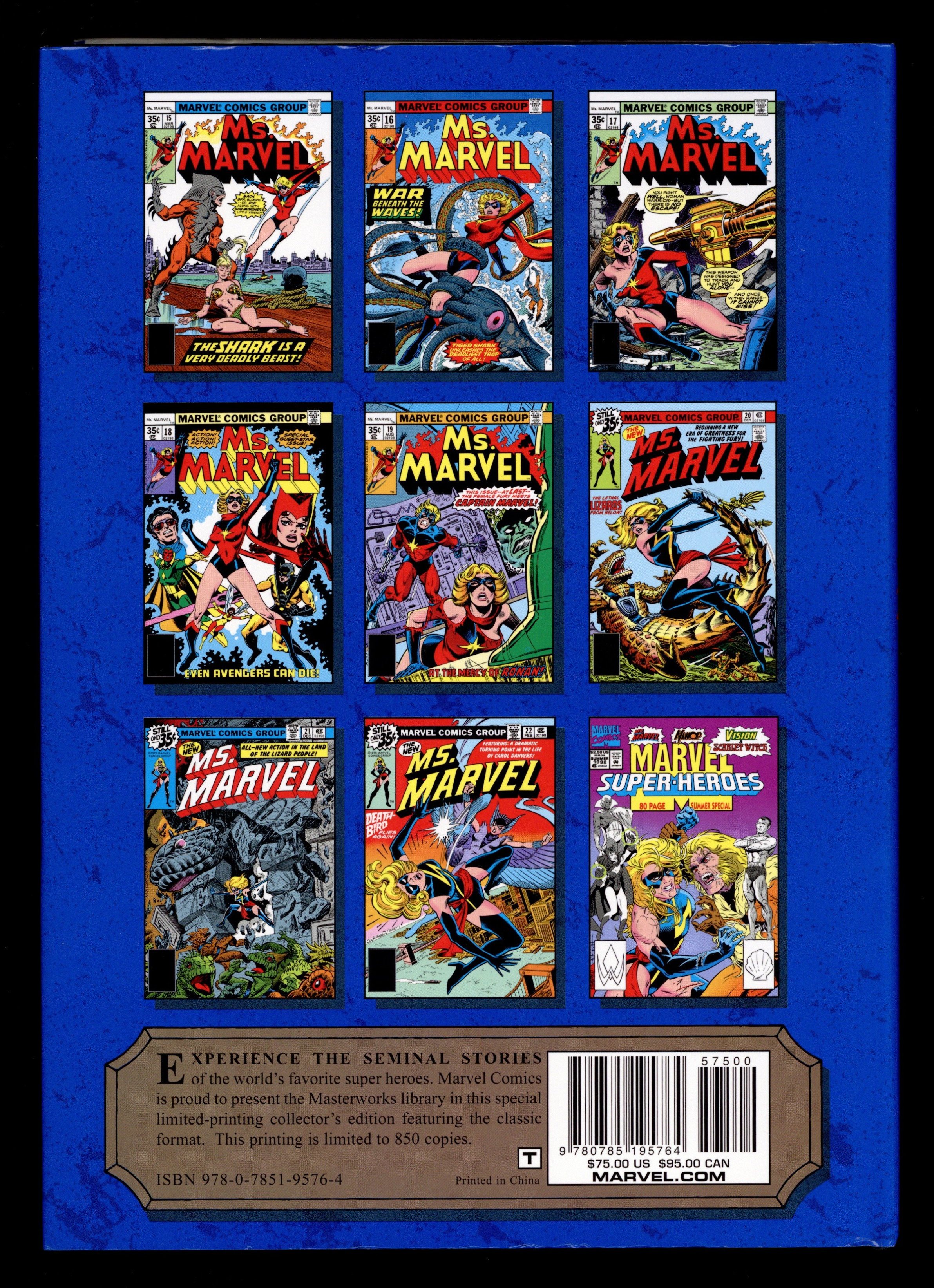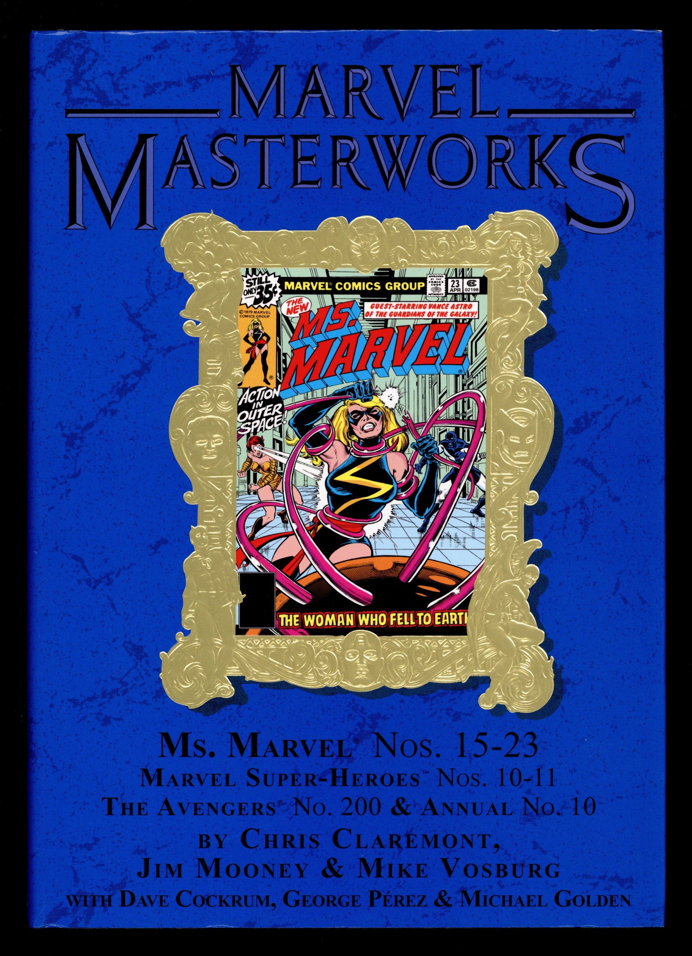 Volume 234 - 1st printing. "Ms. Marvel: Book 2!" Collects Ms. Marvel (1977-1979 1st Series) #15-23, Avengers (1963-1996 1st Series) #200, Avengers (1963-1996 1st Series) Annual #10 and material from Marvel Super Heroes (1990-1993 2nd Series) #10-11, Avengers (1963-1996 1st Series) #197-199 and Marvel Fanfare (1982-1992 1st Series) #24. Cover by George Perez. Chris Claremont weaves complex plots and compelling characterization in our second Ms. Marvel Masterworks, concluding Carol Danvers' original adventures! The highlights are many: Ms. Marvel meets the Avengers! Mystique makes her first appearance! A battle with Ronan the Accuser brings Ms. Marvel and Captain Marvel together, and leads to an all-new look for our heroine! Encounters with underground lizard-men, Deathbird, the Guardians of the Galaxy and Sabretooth set the stage for a controversial Avengers saga and a life-altering battle with Mystique and Rogue. And the story reaches its epic conclusion in a Marvel milestone featuring Ms. Marvel, the X-Men and the Avengers! Hardcover, 328 pages, full color. NOTE: Limited to 850 copies. Cover price $75.00.