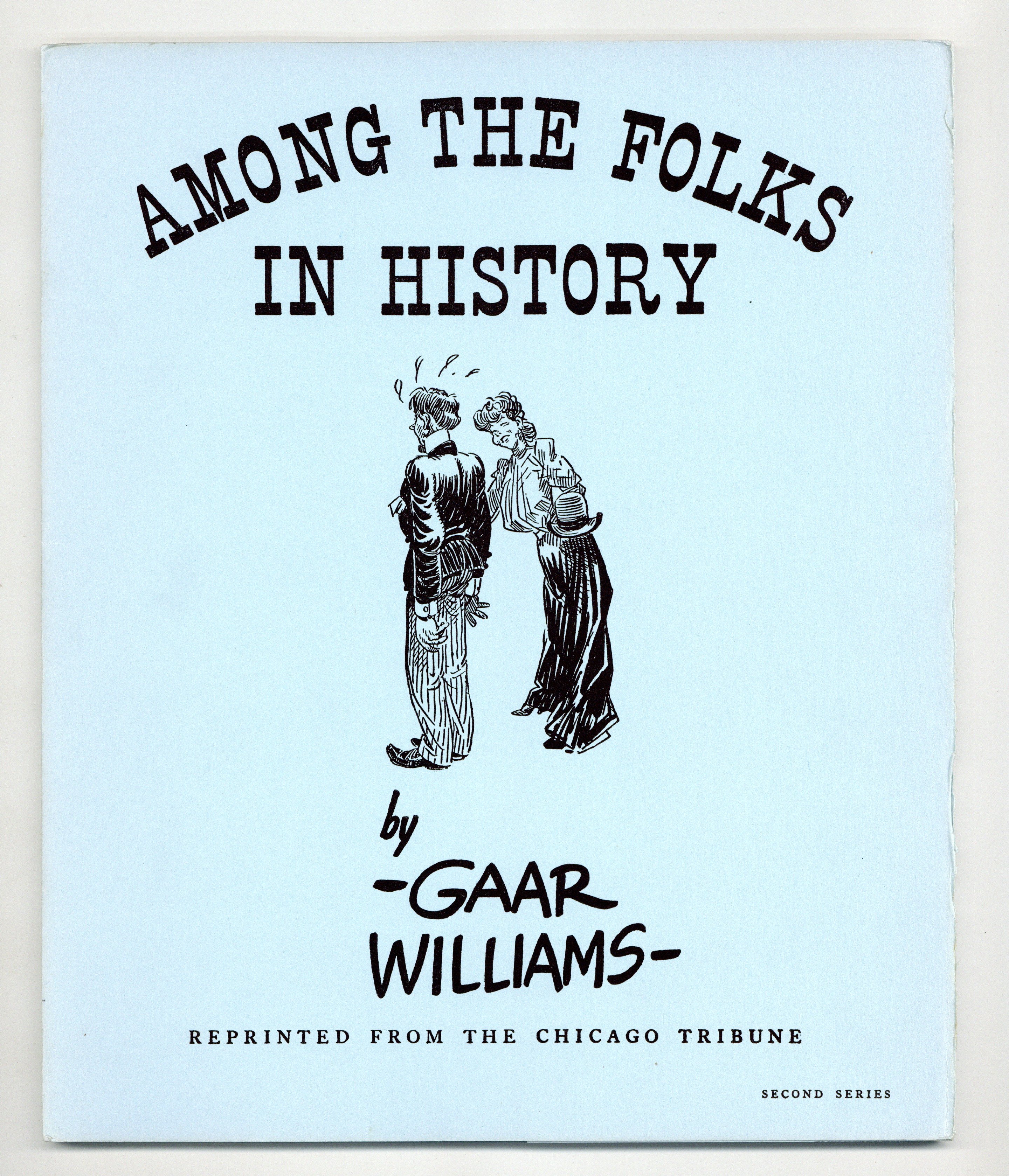 Set-02 - "Among the Folks in History - Second Series!" Portfolio by Gaar Williams. Gaar Williams, whose life in the Midwestern small town of Richmond in the 1890's gave inspiration to his popular work, served as a staff artist for the Chicago Daily News and the Indianapolis News before settling in Chicago permanently to work for the Chicago Tribune until his death in 1935. Gaar Williams's cartoons could be seen in thirty-nine newspapers around the country. These prints are reproductions of cartoons that originally appeared in the Chicago Tribune newspaper from 1927-1934. SET-02 includes 25 prints, B&W, held in a wrap-around slip folder. 8.25-in. x 10.25-in.