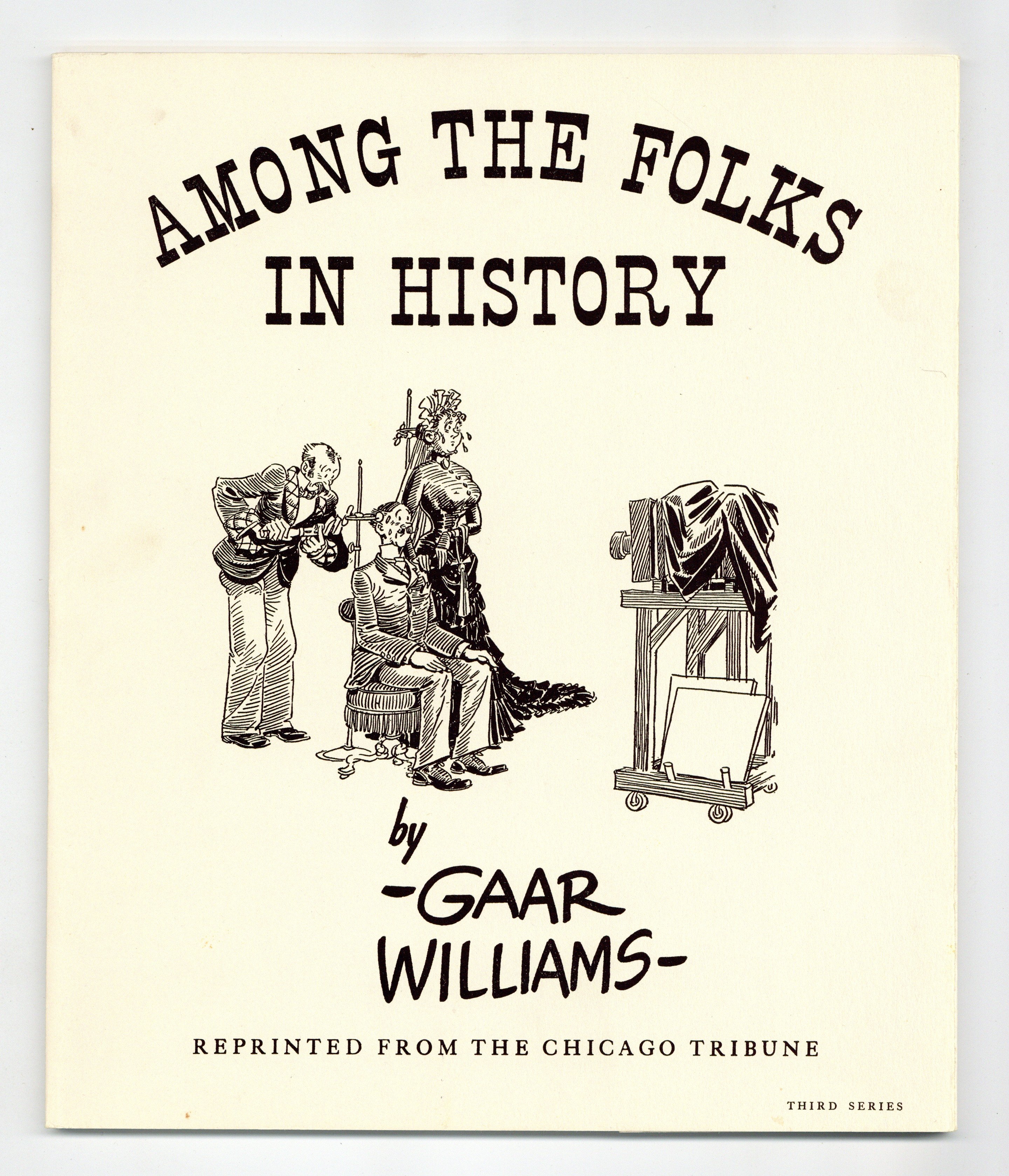 Published 1935 (est.) by Chicago Tribune.$39.00Set-03 - "Among the Folks in History - Third Series!" Portfolio by Gaar Williams. Gaar Williams, whose life in the Midwestern small town of Richmond in the 1890's gave inspiration to his popular work, served as a staff artist for the Chicago Daily News and the Indianapolis News before settling in Chicago permanently to work for the Chicago Tribune until his death in 1935. Gaar Williams's cartoons could be seen in thirty-nine newspapers around the country. These prints are reproductions of cartoons that originally appeared in the Chicago Tribune newspaper from 1927-1934. SET-03 includes 25 prints, B&W, held in a wrap-around slip folder. 8.25-in. x 10.25-in.