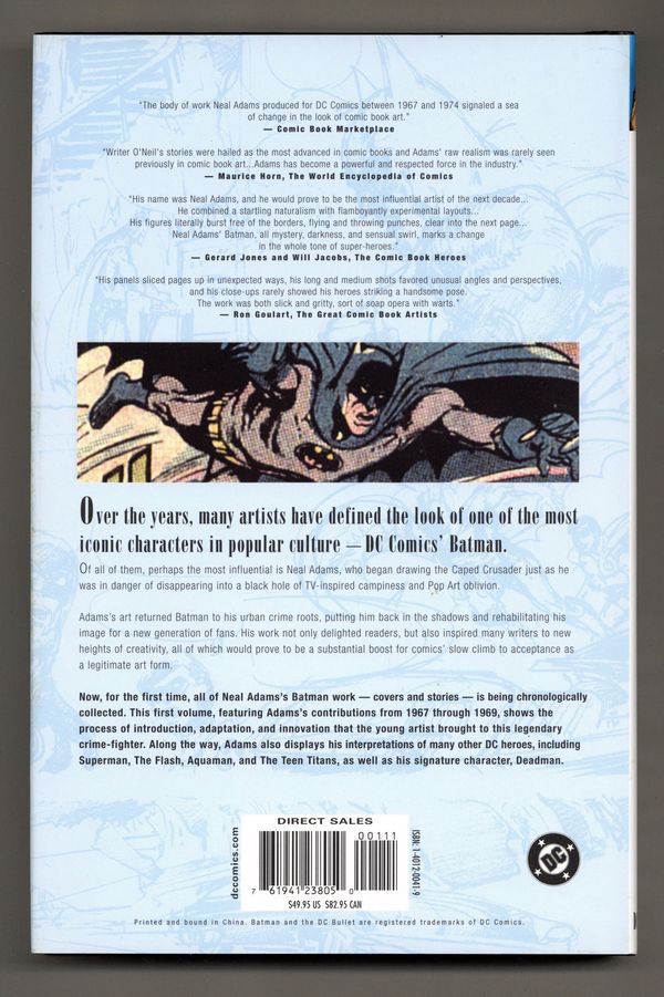 Volume 1 - 1st printing. Collects Batman (1940-2011) #200, 203 and 210; THE Brave and the Bold (1955-1983 1st Series DC) 75-76 and 79-85; Detective Comics (1937-2011 1st Series) #370, 372, 385, 389, 391, and 392; and World's Finest (1941-1986) #174-176, 178-180, 182-183, 185, and 186. Art and cover by NEAL ADAMS. The first of three hardcover volumes chronologically collecting the early Batman work of the legendary Neal Adams! Hardcover, 240 pages, full color. Cover price $49.95.