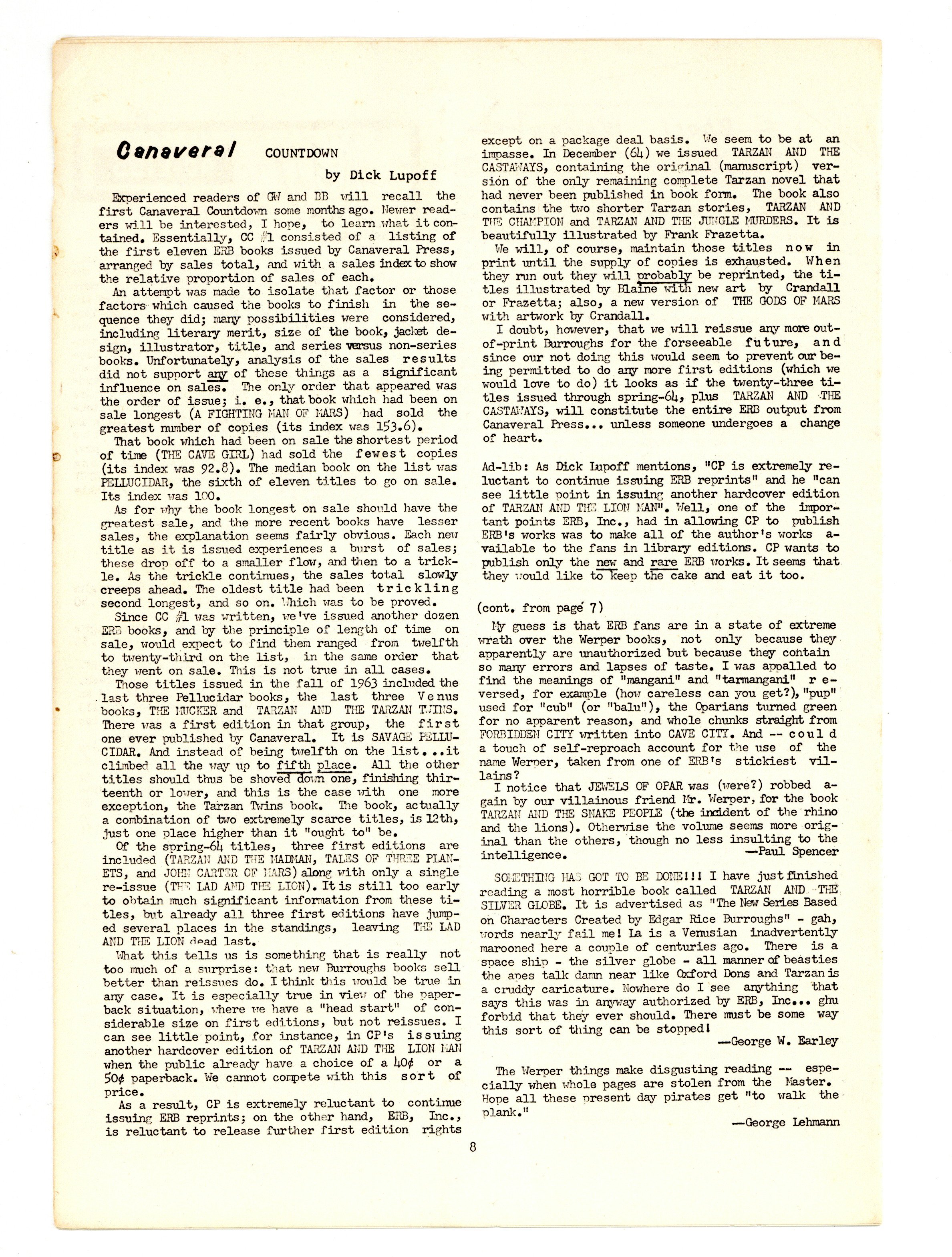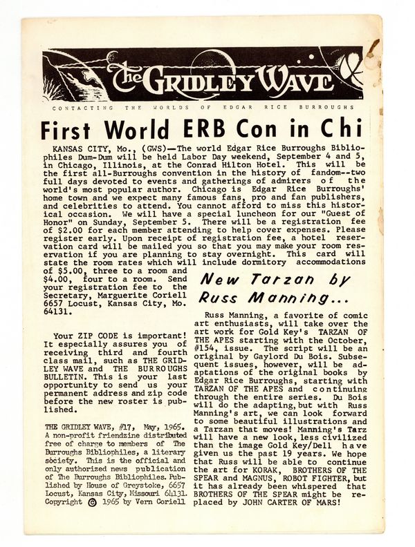 Published May 1965 by Edgar Rice Burroughs, Inc.$2.65Tarzan newsletter by Vernell Coriell. First all-Burroughs convention, New Tarzan by Russ Manning, New Tarzan star - Mike Henry. 7-in. x 10-in., 8 Pages. B&W.