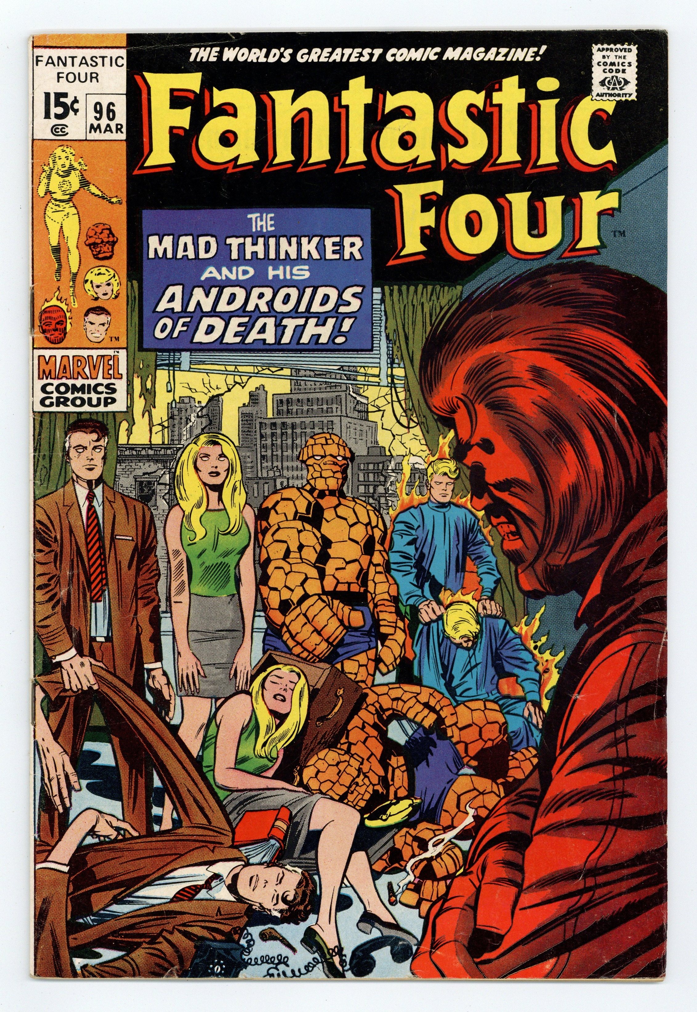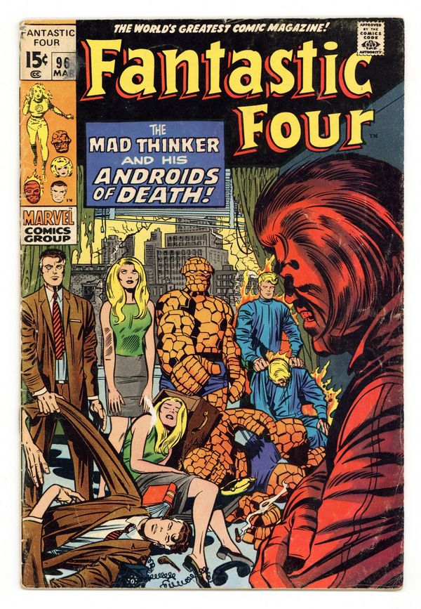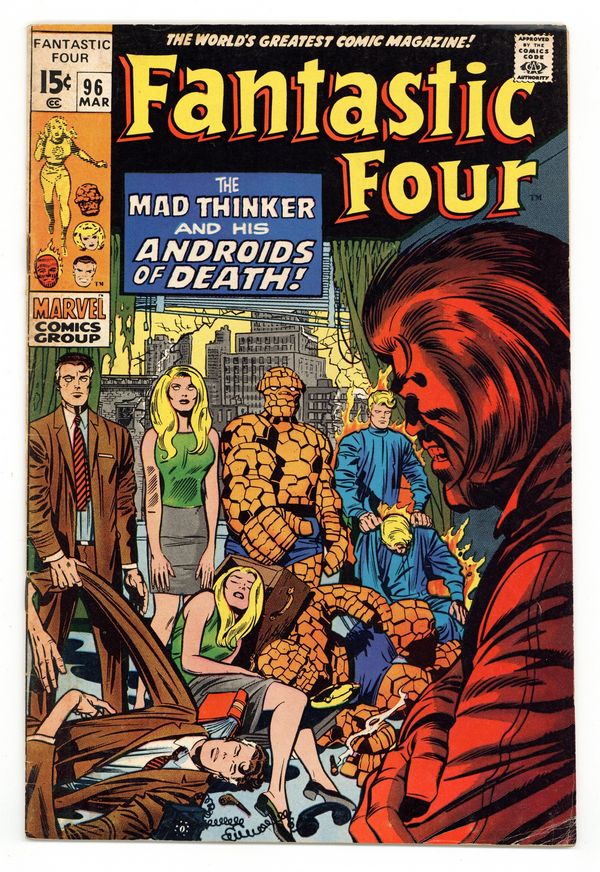 "The Mad Thinker and His Androids of Death!" Script by Stan Lee. Pencils by Jack Kirby. Inks by Frank Giacoia. Cover by Jack Kirby, Joe Sinnott, and Marie Severin (backgrounds). A quiet afternoon at the Baxter Building is interrupted by a surprise attack against Ben Grimm…by the Human Torch! Oh my, why has Johnny Storm ambushed his long-time friend? But hold on, is that really the FF's youngest member or a well-constructed android look-a-like? Using his trademark exact calculations, the Mad Thinker sends his replica androids to capture the Fantastic Four! And with textbook precision the thinker's sinister plan rolls towards completion! However, the FF's familiar foe may have once again miscalculated the human element! Giving Mister Fantastic an opportunity to outthink the thinker! (Note: The Mad Thinker returns in Fantastic Four 100.) 36 pages Cover price $0.15.