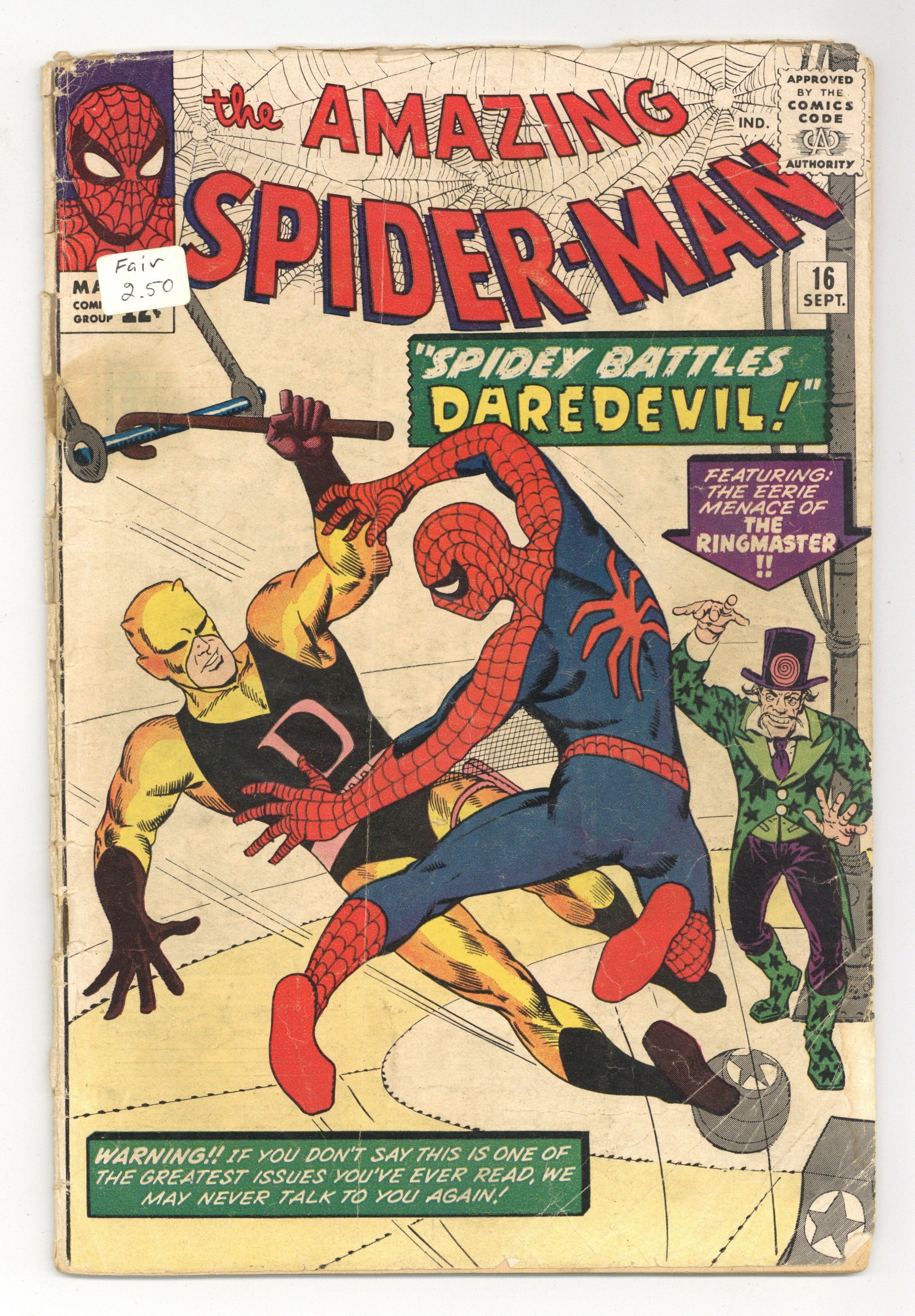 Cover art by Steve Ditko. Duel with Daredevil, script by Stan Lee, art by Steve Ditko; When the Circus of Crime comes to town, they advertise that Spider-Man will be appearing in an attempt to fill the big top before they rob it; Spider-Man sees the advertisements and decides he will show up; He is hypnotized along with the rest of the audience, but unfortunately for the Circus of Crime, the Daredevil is in attendance and immune to the Ringmaster's hat. Reprinted in Marvel Tales # 11 and 154. 36 pgs. $0.12. Cover price $0.12.