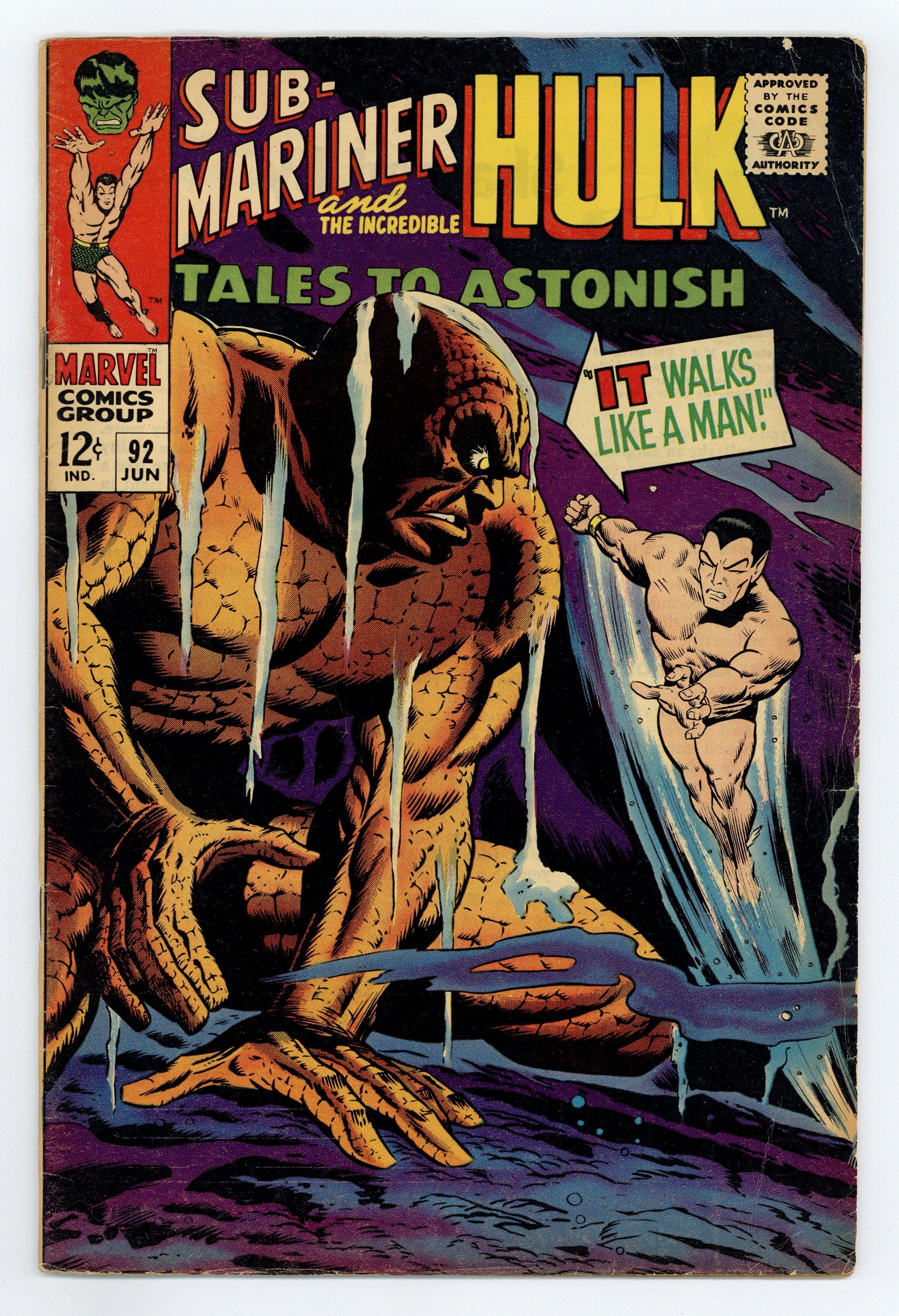 $15.00Cover by Don Heck and Dan Adkins. :It Walks Like a Man!, script by Stan Lee, art by Dan Adkins; When a passing ship dumps a radioactive barrel into Namor's realm, he realizes the danger it poses and takes it far away from Atlantis to throw it into a deep crevasse; Little does he know that the radiation in the barrel has awakened an ancient monster who begins to menace both the surface world and the world beneath the waves alike. Turning Point!, script by Stan Lee, art by Marie Severin and Frank Giacoia; Betty bemoans her loss of Bruce; Bruce, in disguise, bemoans his circumstances, then transforms into Hulk who flees his hotel room in typical Hulk fashion - through the wall; Outside, Hulk sees a 'flying saucer' and leaps to bring it down so the aliens can take him far from Earth; What he brings down is not a saucer but the mighty Silver Surfer! 36 pgs., full color. $0.12. Cover price $0.12.