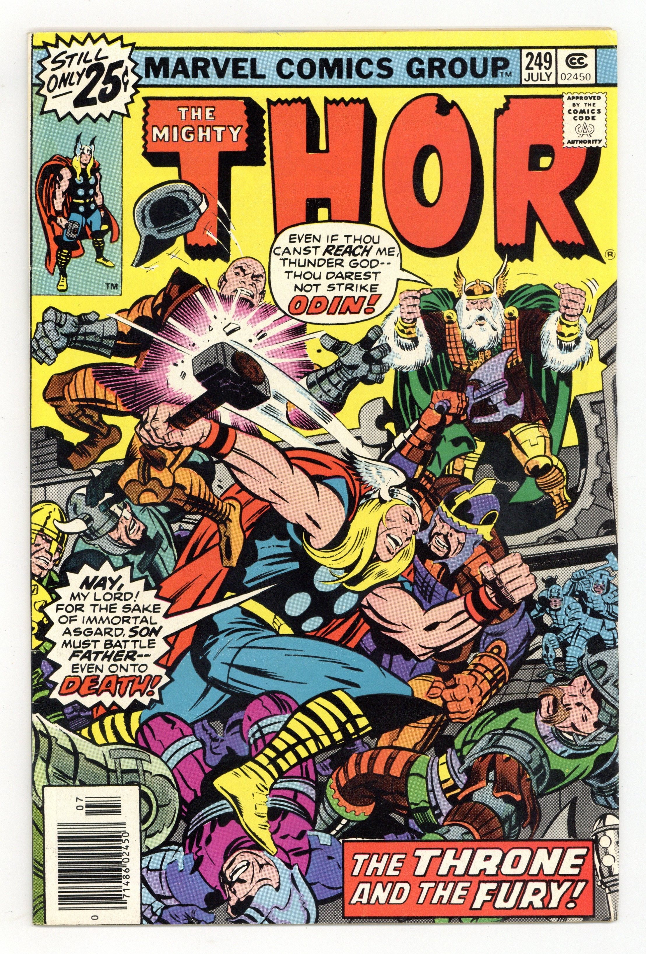 Cover pencils by Jack Kirby, inks by Joe Sinnott. "The Throne and the Fury!", script by Len Wein, pencils by John Buscema (breakdowns) and Tony DeZuniga (finished art), inks by Tony DeZuniga; Plot assist by Marv Wolfman; Thor goes to try and talk to Odin, but is prevented by the palace guards and a mystic field that even Mjolnir cannot penetrate; Odin has his men move the Odinsword to the throne room, where he can pull it from the scabbard at a moment's notice; The group goes to seek Karnilla's help in breaching the mystic barrier; Thor barely manages to get through before it reseals itself; Thor then confronts Odin, only to have him reveal that it's not really Odin at all - it's Mangog sitting upon the Odinsword. Appearances by Balder, Hogun, Fandral, and Volstagg. The letters page contains Marvel Value Stamp series B #98 (Fantastic Four). 36 pgs., full color. $0.25. Cover price $0.25.