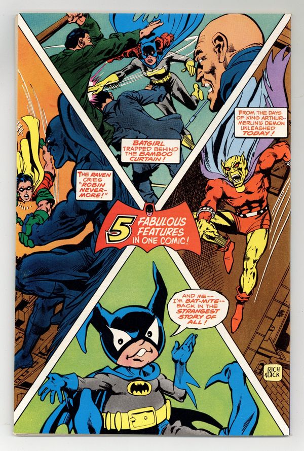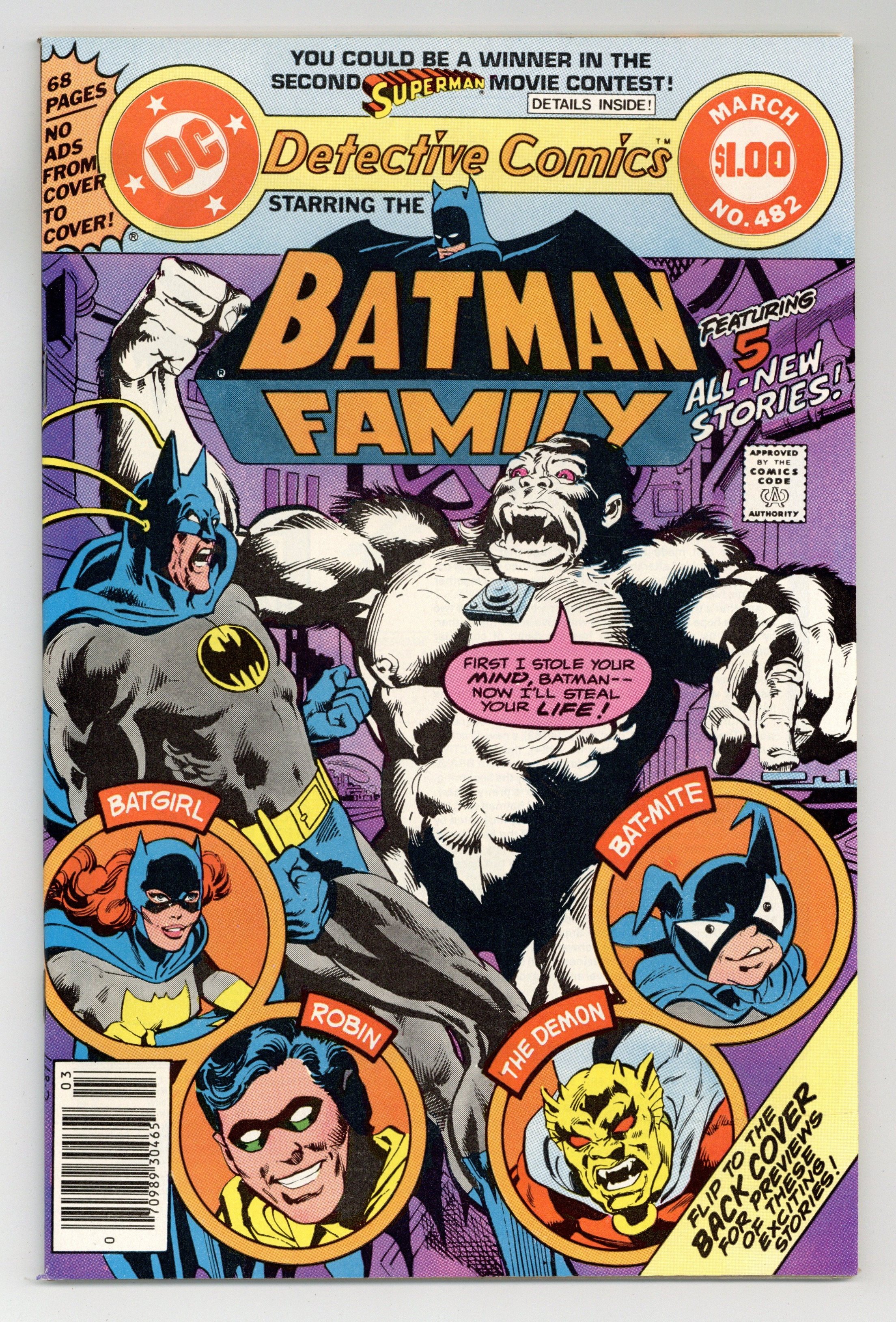 68-page giant. Cover pencils by Rich Buckler, inks by Dick Giordano. "Night of the Body Snatcher!" script by Jim Starlin, pencils by Jim Starlin, inks by P. Craig Russell; Batman is overpowered by the white ape-body of Xavier Simon and must quickly find a way to prevent Simon from transferring his own mind into the Caped Crusaders body. "A Quick Death in China!" script by Bob Rozakis, pencils by Don Heck, inks by Frank Chiaramonte; Wo Fong mistakenly thinks Barbara Gordon's friend, Leslie, is really Batgirl and tries to make her reveal super-heroic secrets; Meanwhile, the real Batgirl and her brother Tony Gordon team together to combat Wo Fong and his Sino-Supermen. "The Eternity Book" starring The Demon, script by Len Wein, pencils by Mike Golden, inks by Dick Giordano. "Bat-Mite's New York Adventure!" script by Bob Rozakis, pencils by Michael Golden, inks by Bob Smith. "The League of Crime!" starring Robin, script by Bob Rozakis, pencils by Juan Ortiz, inks by Dave Hunt. 68 pgs., full color. $1.00. Cover price $1.00.