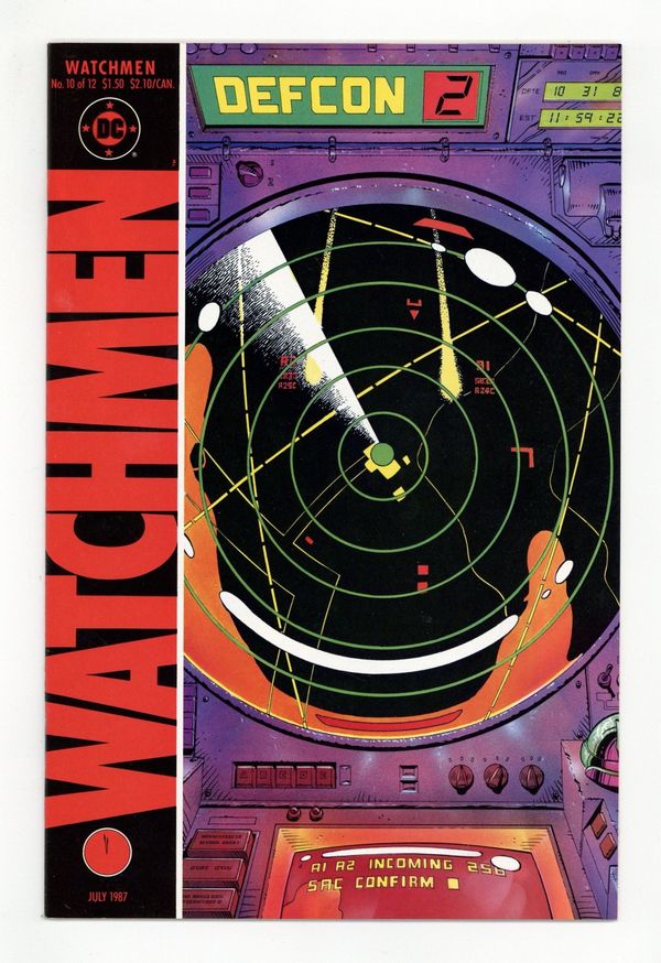"Two riders were approaching". Part 10 of 12. Story by Alan Moore. Art and cover by Dave Gibbons. Rorschach and Night Owl continue their detective work and finally discover who is behind the conspiracy. This is not a good thing. Includes four page fictional text feature with a view of Adrian Veidt's scrapbook. 32 pages. Full color. No ads. Cover price $1.50.