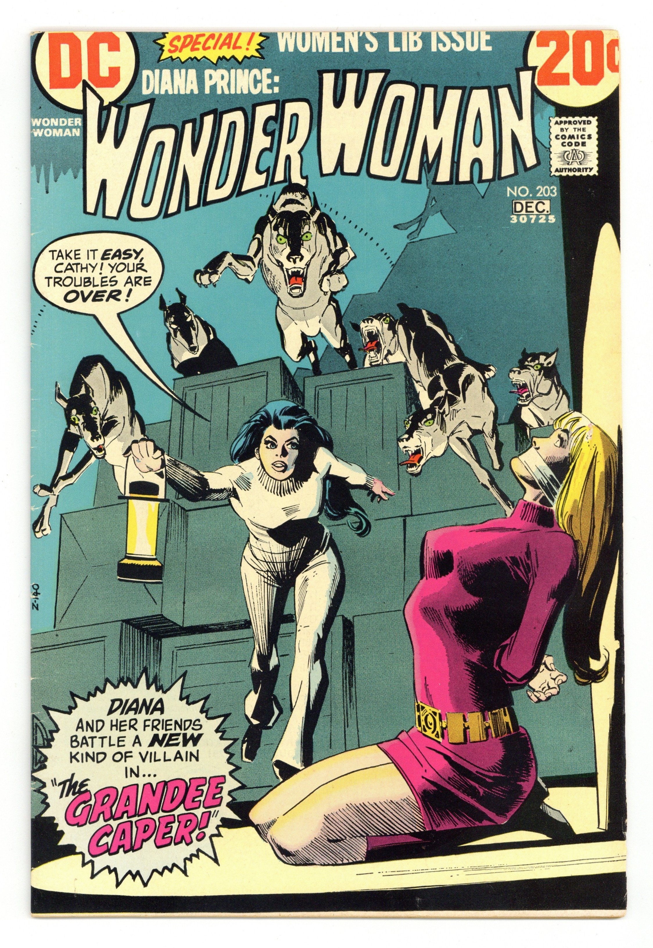 Cover by Dick Giordano. Womens lib story "The Grandee Caper," script by Samuel R. Delany, art by Dick Giordano; After Cathy Perkins starts a fight with some wolfish "admirers" of Diana (and Diana ends it), the now-homeless Diana moves in with her former assistant, whom she learns is now enrolled in a womens liberation group and is taking karate lessons; Diana is offered a job at Grandees Department Store by Mr. Grandee, its owner, who wishes to pay her big bucks for appearing in ads for his store as the symbol of the new liberated woman. 36 pages, Full Color. Cover price $0.20.