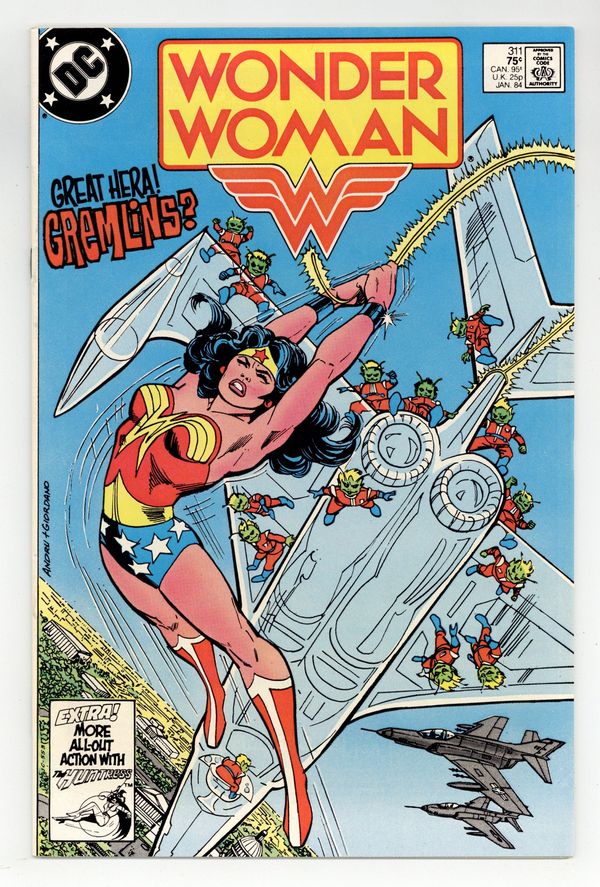 Tags: Wonder Woman$19.25Cover pencils by Ross Andru, inks by Dick Giordano. "Gremlins!", script by Dan Mishkin, art by Don Heck; Wonder Woman and Steve Trevor are taken to an island in the sky when their planes are disabled by gremlins. "Crocodile Tears," script by Joey Cavalieri, pencils by Tim Burgard, inks by Mike DeCarlo; Huntress vs. Earthworm. Letter to the editor from T.M. Maple. 36 pages, Full Color. Cover price $0.75.