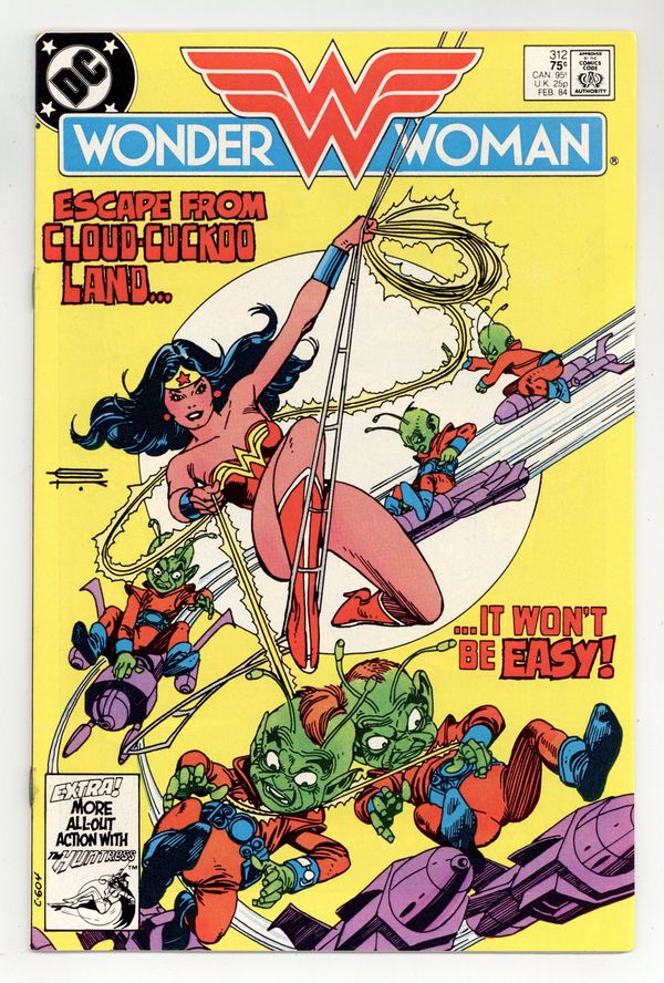 Tags: Wonder Woman$13.00Cover by Gil Kane. "Escape!", script by Dan Mishkin, art by Don Heck; Wonder Woman and Steve Trevor learn the Gremlins history and attempt to retrieve the Robot Plane from them before the Gremlins mother-craft returns to the stars. "The Voice of the People," script by Joey Cavalieri, art by Dan Spiegle; Huntress vs. Earthworm. 36 pages, Full Color. Cover price $0.75.