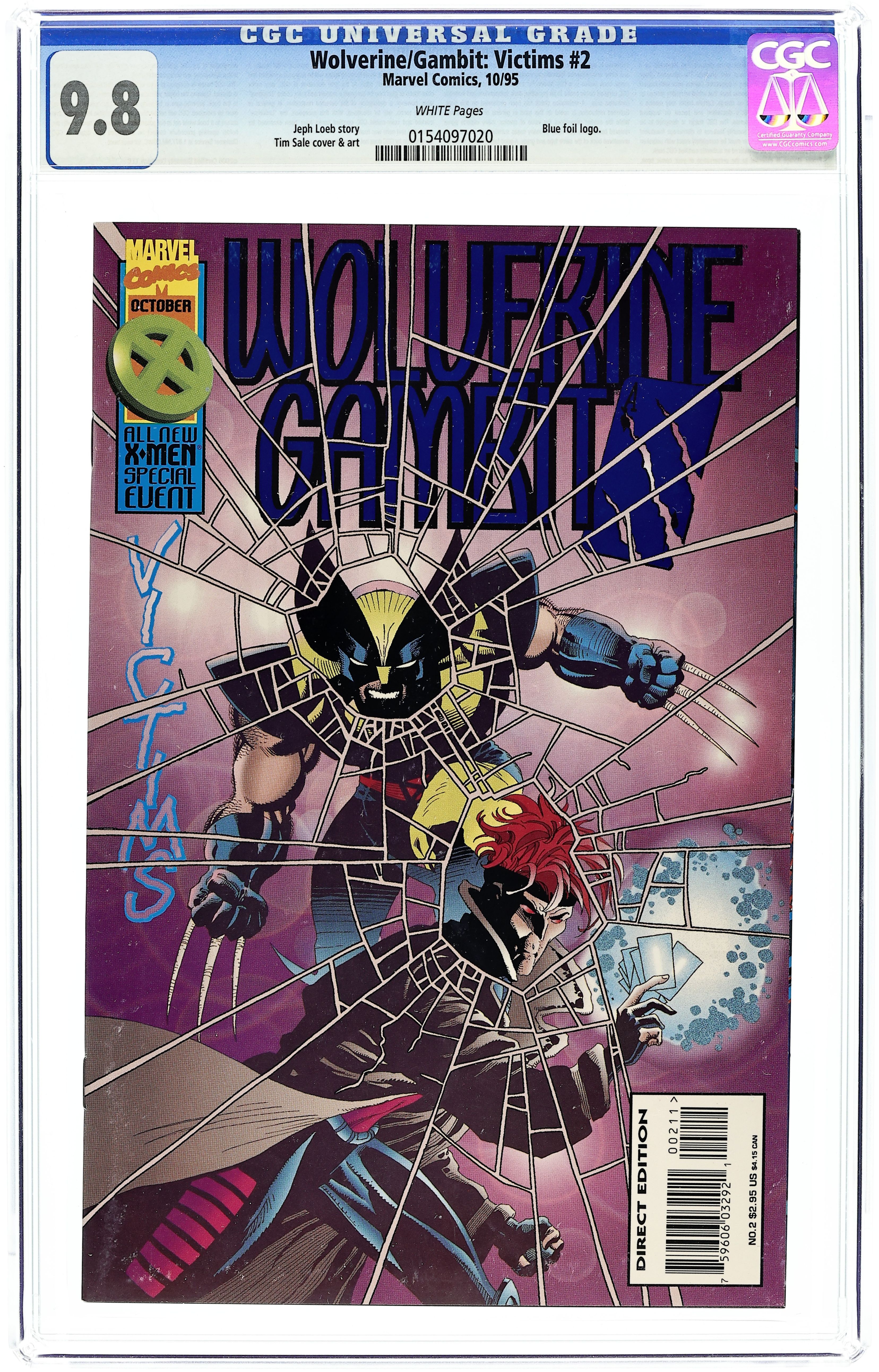 Cover by Tim Sale. Blue foil title. Victims Part 2: In Deep, script by Jeph Loeb, art by Tim Sale; With women being slashed to death in London and a mutant killer being the suspect, Wolvie and Gambit find themselves surrounded by police, intent on arresting them; They are helped out of their jam by Martinique who claims to have been sent by Nick Fury; As they crash the getaway car into the Thames and crawl into the dark sewers to escape, Gambit lights a match only to find that Logan has gutted their ally; As they wander the tunnels trying to find a way out, Wolvie begins to suspect that someone is messing with their minds. 36 pgs., full color. $2.95. Cover price $2.95.