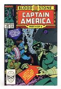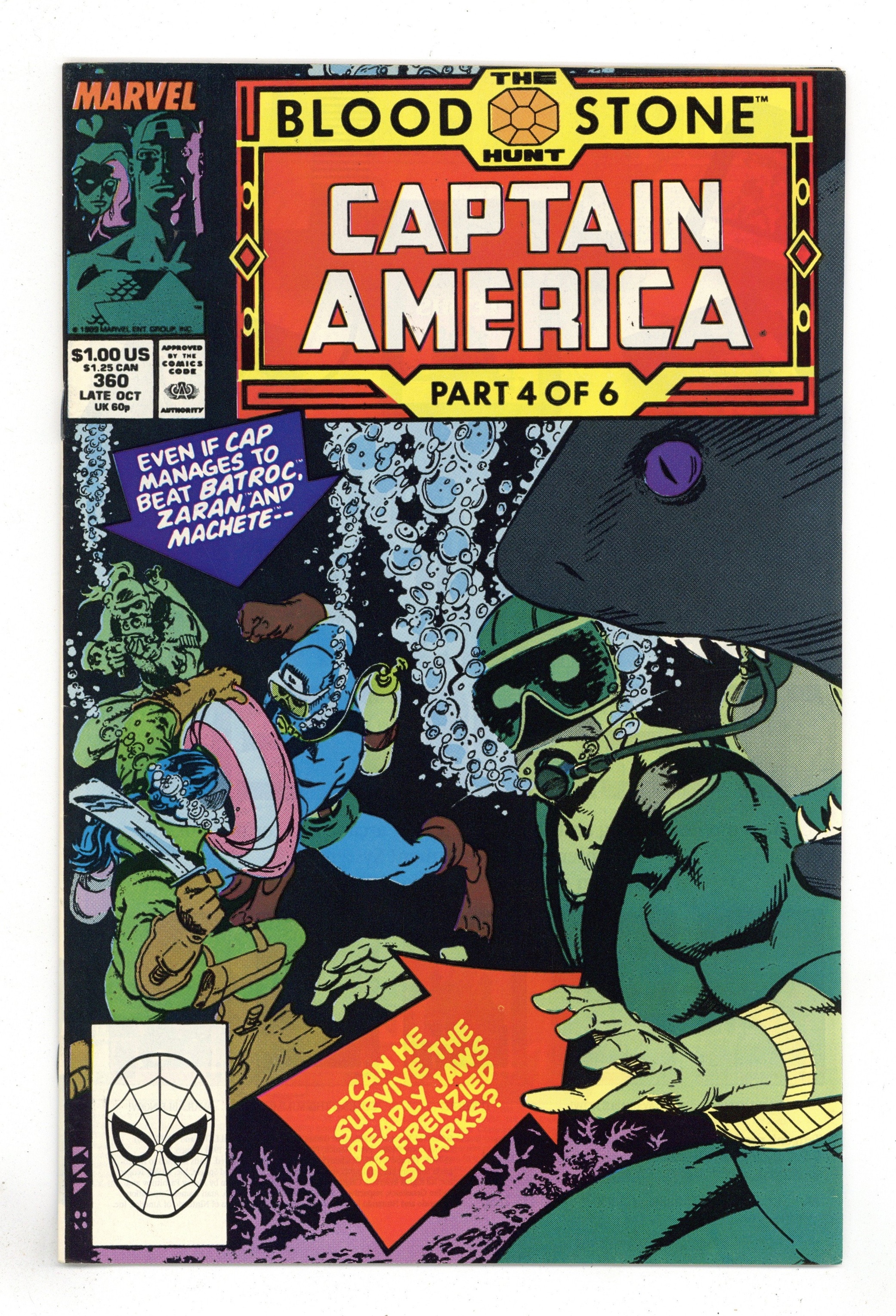 Tags: Bloodstone Hunt (part 4), Marvel Legacy Numbering: Captain America (part 360), Scourge of the Underworld (part 11)$5.30Direct Edition. "Blood in the Sea" Part 4 of 6. Story by Mark Gruenwald and Kieron Dwyer. Art by Kieron Dwyer and Danny Bulanadi. Cover by Kieron Dwyer and Al Milgrom. Off the Bermuda shore, an undersea battle is in progress among Captain America, Batroc, Machete, and Zaran; when suddenly a school of sharks decides to join the action! Meanwhile, Diamondback sneaks on board Baron Zemo's yacht and pilfers two of the bloodstone jewels. At the end of the day, Cap and Diamondback have two of the five bloodstone jewels and Baron Zemo has one. The hunt for the remaining two continues in Egypt. First appearance of Crossbones. Back up story: "Conflagration" Part 3 of the Night of the Scourge. Story by Mark Gruenwald. Art by Mark Bright and Don Hudson. The U.S. Agent battles Scourge, but only one of them will be left standing by night's end! 36 pgs. Cover price $1.00.