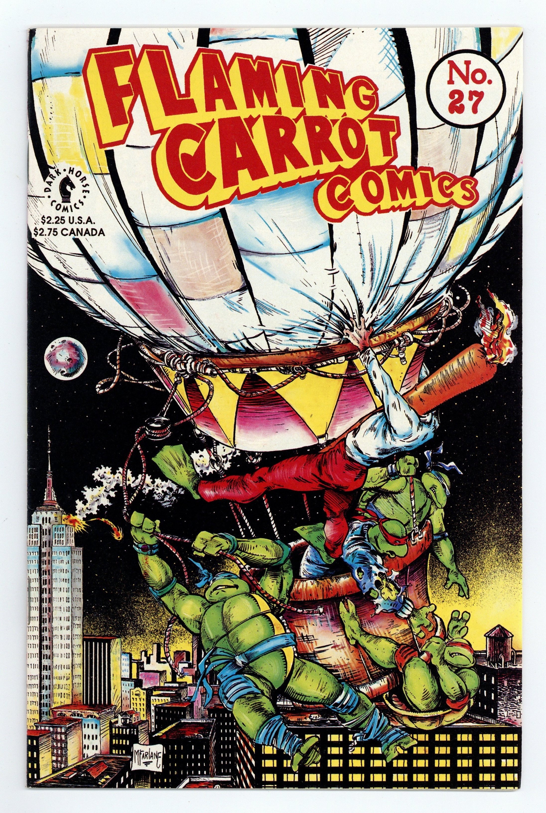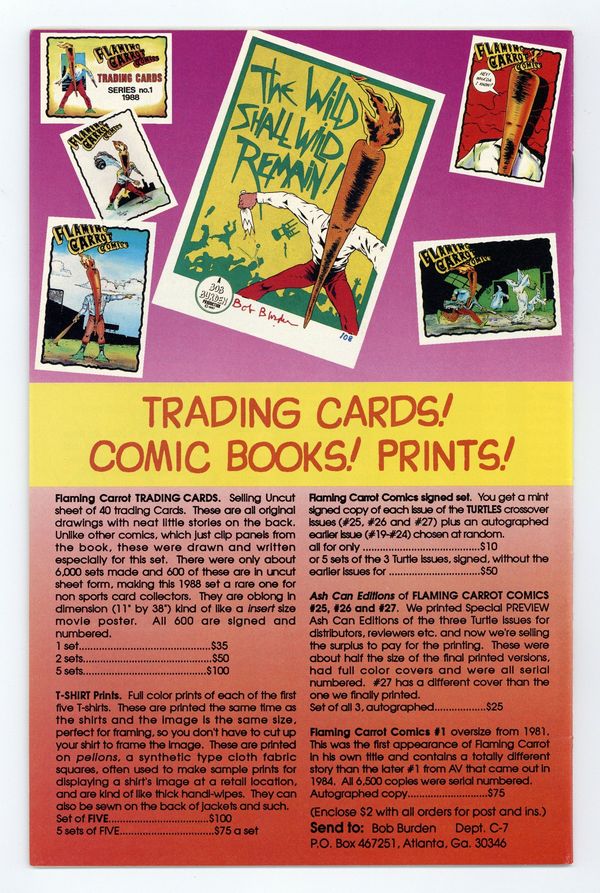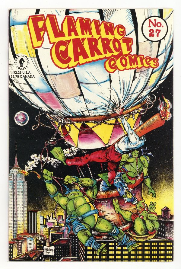 Flaming Carrot/TMNT Crossover: Part 3 -of 3 -Story and art by Bob Burden. Guest-starring the Teenage Mutant Ninja Turtles. "Fearless Umpire Killers," the three-part Flaming Carrot/Teenage Mutant Ninja Turtles crossover concludes! It's night in sleepy Mill City, but the streets are anything but quiet as the Flaming Carrot and his new-found pals the Teenage Mutant Ninja Turtles take on a legion of renegade umpires! 32 pages, B&W. Cover price $2.25.