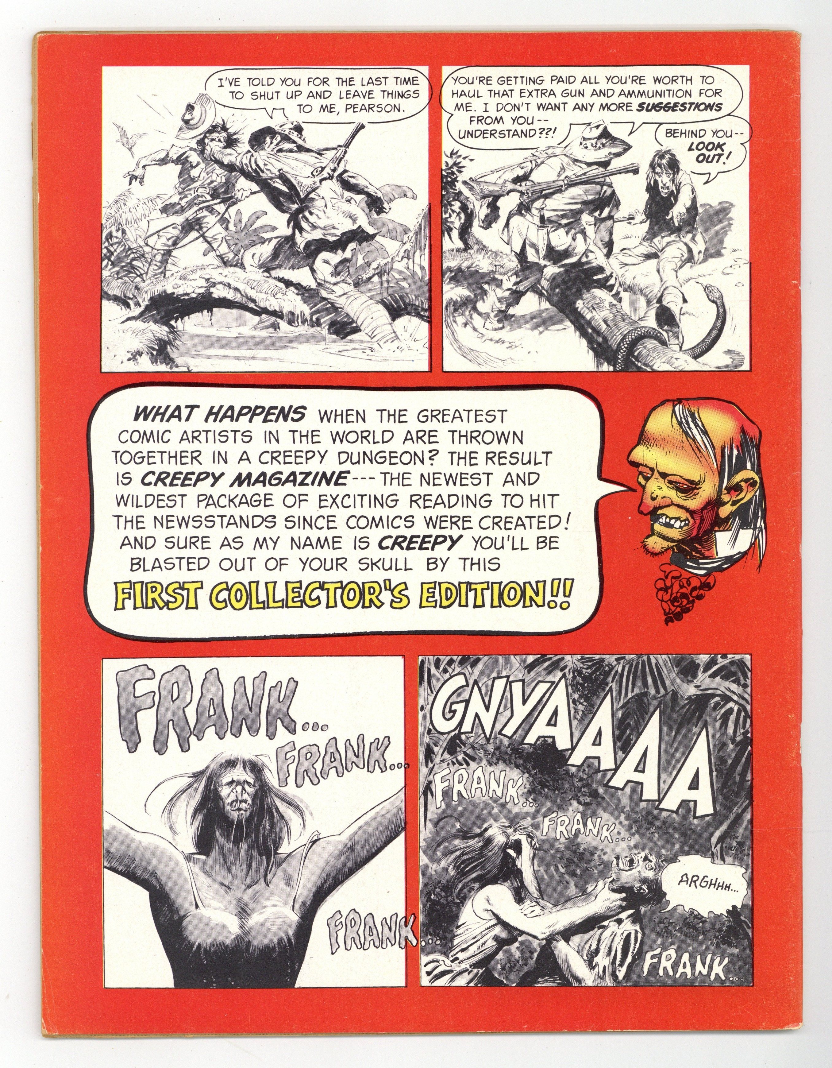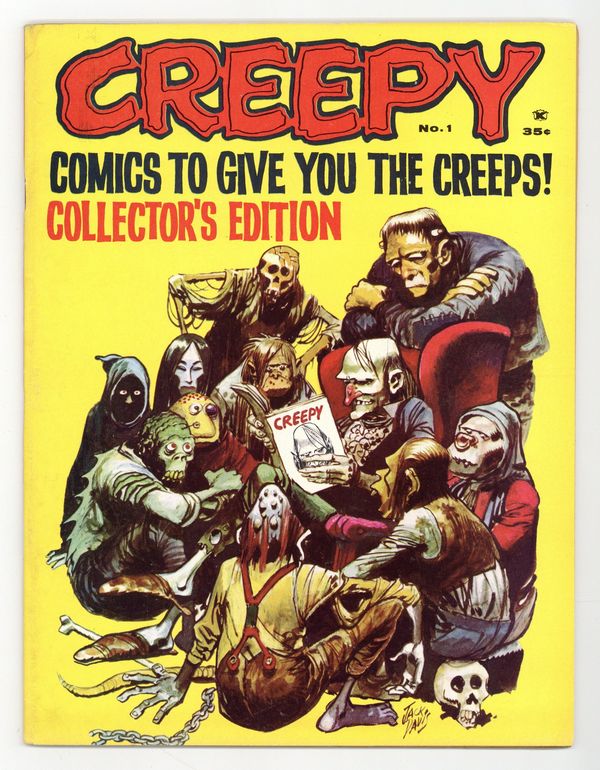 When the Comics Code Authority cracked down on the comic book industry in 1955, horror comics all but faded from the scene. Enter Creepy magazine, publisher James Warren's tribute (after a fashion) to EC's vaunted horror comics line, which couldn't survive the Code's strong arm censorship tactics. Magazines weren't subject to the same rules, giving Warren the freedom to publish more mature content. Eerie, Vampirella, and other Warren publications followed. Stories in this first issue of Creepy include: Voodoo by Bill Pearson and Joe Orlando; H2O World! by Larry Ivie, Al Williamson, and Roy G. Krenkel; Vampires fly at Dusk! by Archie Goodwin and Reed Crandall; Werewolf! by Larry Ivie and Frank Frazetta; Bewitched! by Larry Ivie and Gray Morrow; The Success Story by Archie Goodwin and Al Williamson; and Pursuit of the Vampire! by Archie Goodwin and Angelo Torres. Features the first appearance of Uncle Creepy. Cover art by Jack Davis. Cover price $0.35.