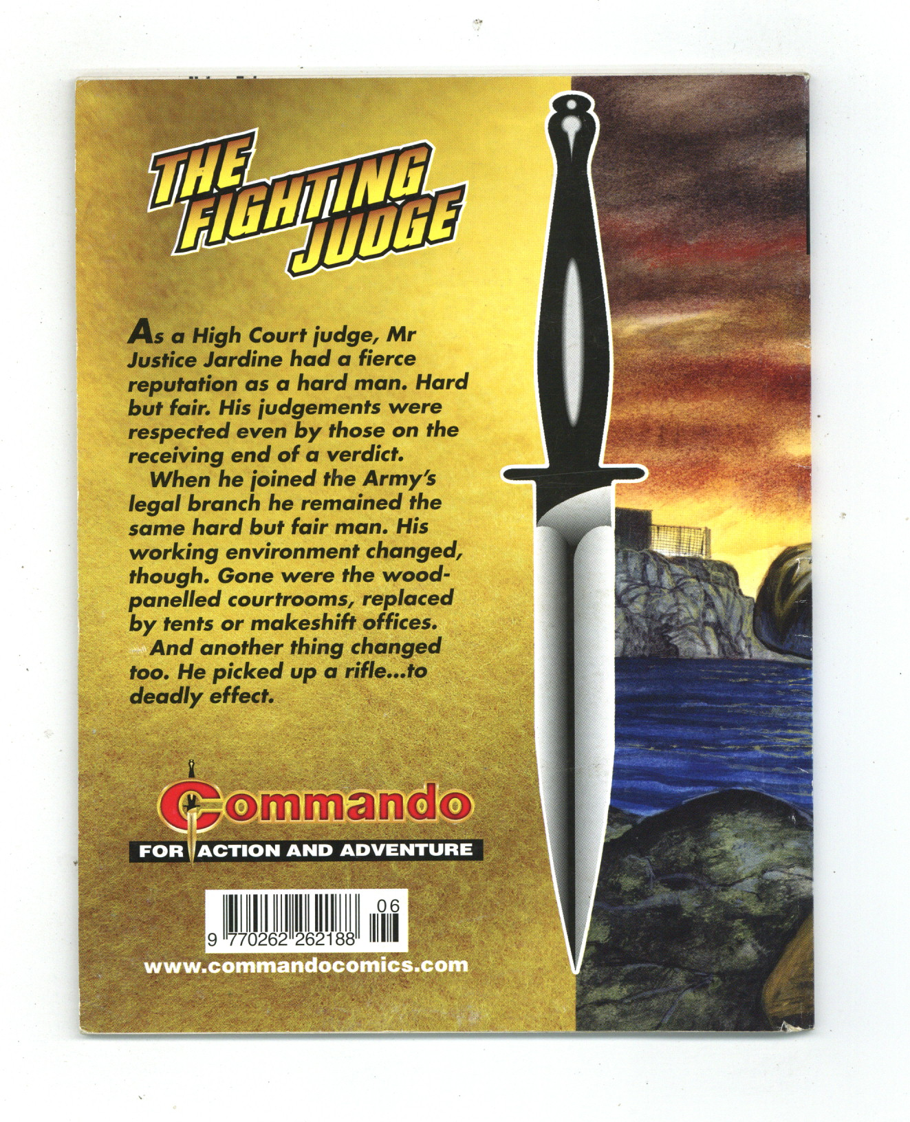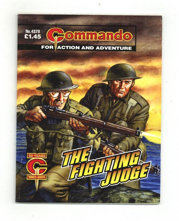 Published Mar 2011 by D. C. Thomson & Co..$4.00The Fighting Judge - Written by Alan Hebden. Art and Cover by Mike White. As a High Court judge, Mr. Justice Jardine had a fierce reputation as a hard man. Hard but fair. His judgements were respected even by those on the receiving end of a verdict. When he joined the Army's legal branch, he remained the same hard but fair man. His working environment changed, though. Gone were the wood-panelled courtrooms, replaced by tents or makeshift offices. And another thing changed, too. He picked up a rifle...to deadly effect. Weekly British War comics digest. Softcover, 5 1/2-in. x 6 1/2-in., 68 pages, B&W.