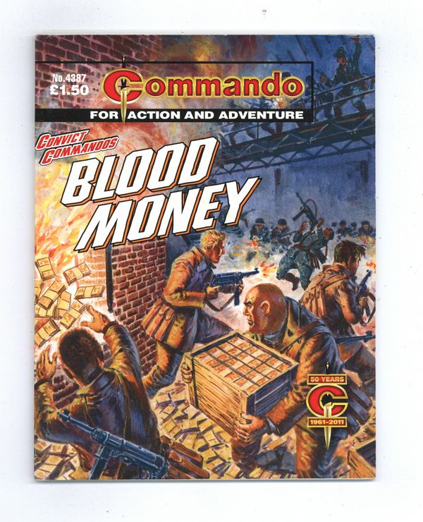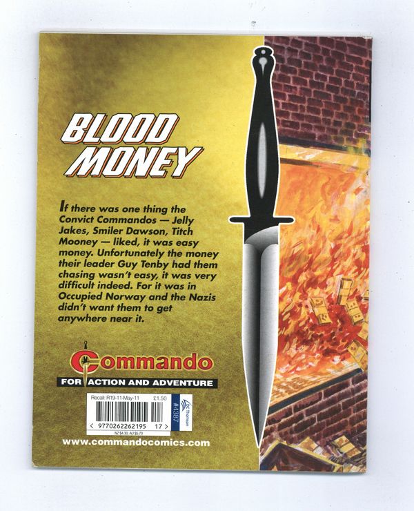 Published Apr 2011 by D. C. Thomson & Co..$4.20Convict Commandos: Blood Money - Written by Alan Hebden. Art and Cover by Manuel Benet. If there was one thing the Convict Commandos -- Jelly Jakes, Smiler Dawson, Titch Mooney -- liked, it was easy money. Unfortunately, the money their leader Guy Tenby had them chasing wasn't easy, it was very difficult indeed. For it was in Nazi-occupied Norway and the Nazis didn't want them to get anywhere near it. Weekly British War comics digest. Softcover, 5 1/2-in. x 6 1/2-in., 68 pages, B&W.