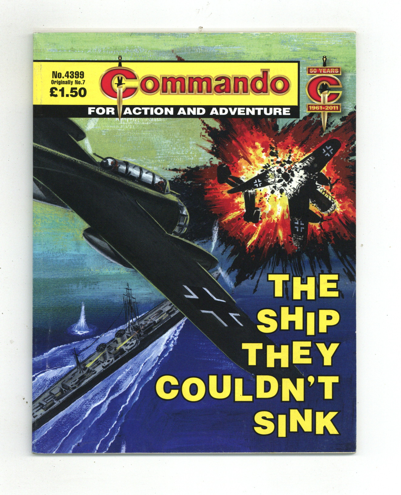 Published Jun 2011 by D. C. Thomson & Co..$4.20Reprinting Commando War Stories in Pictures (1961 D. C. Thomson Digest) #7: The Ship They Couldn't Sink - Written by Gray. Art by Ferran Sostres. Cover by Ken Barr. The mighty German battle-cruiser lay silent in the Atlantic fog, waiting, her guns loaded and ready. And straight into this trap a convoy of heavily-laden merchant ships was sailing. On a radar screen, the German captain watched its progress with a grim smile. He was master of their fate and would spare not a single ship. But there was a gleam of hope for the convoy -- the gleam of the golden badge of the Royal Navy aboard one ship...a tiny ship. But crammed with British fighting courage. Weekly British War comics digest. Softcover, 5 1/2-in. x 6 1/2-in., 68 pages, B&W.