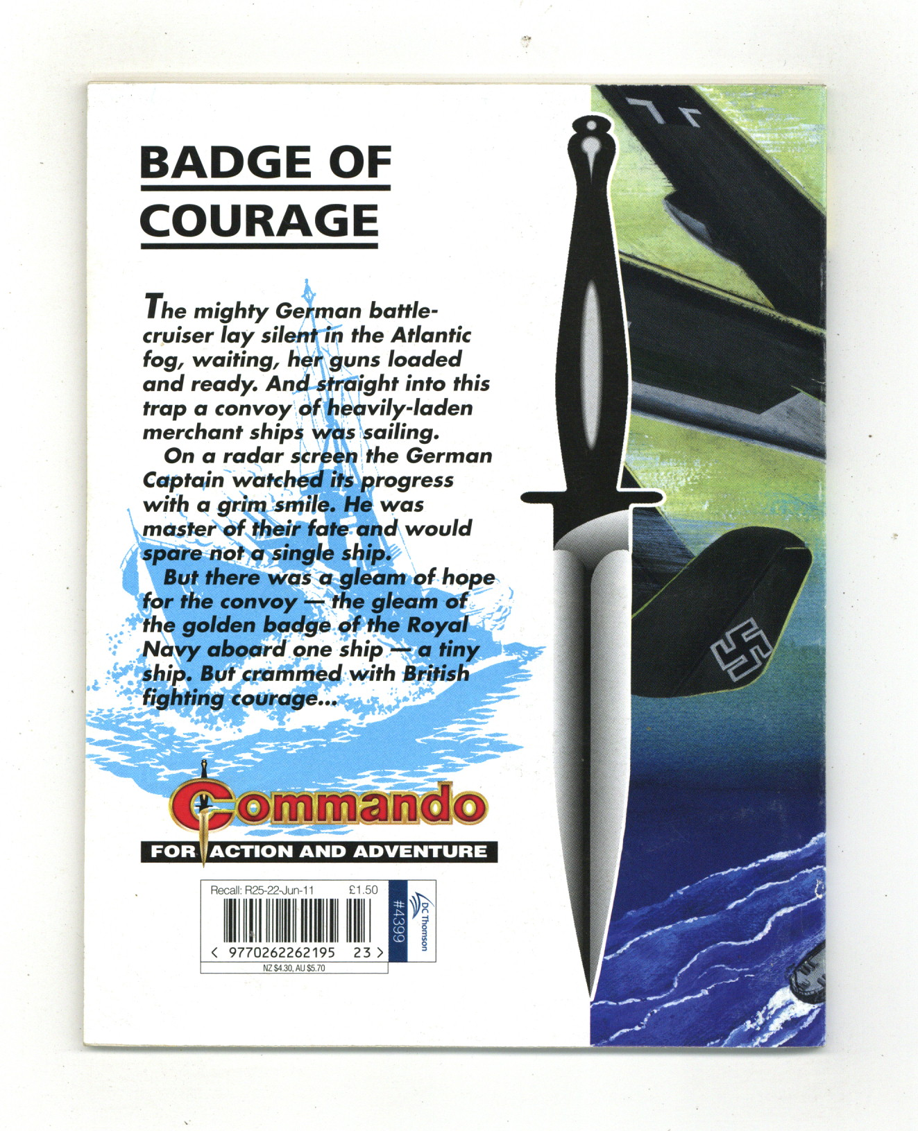 Reprinting Commando War Stories in Pictures (1961 D. C. Thomson Digest) #7: The Ship They Couldn't Sink - Written by Gray. Art by Ferran Sostres. Cover by Ken Barr. The mighty German battle-cruiser lay silent in the Atlantic fog, waiting, her guns loaded and ready. And straight into this trap a convoy of heavily-laden merchant ships was sailing. On a radar screen, the German captain watched its progress with a grim smile. He was master of their fate and would spare not a single ship. But there was a gleam of hope for the convoy -- the gleam of the golden badge of the Royal Navy aboard one ship...a tiny ship. But crammed with British fighting courage. Weekly British War comics digest. Softcover, 5 1/2-in. x 6 1/2-in., 68 pages, B&W.