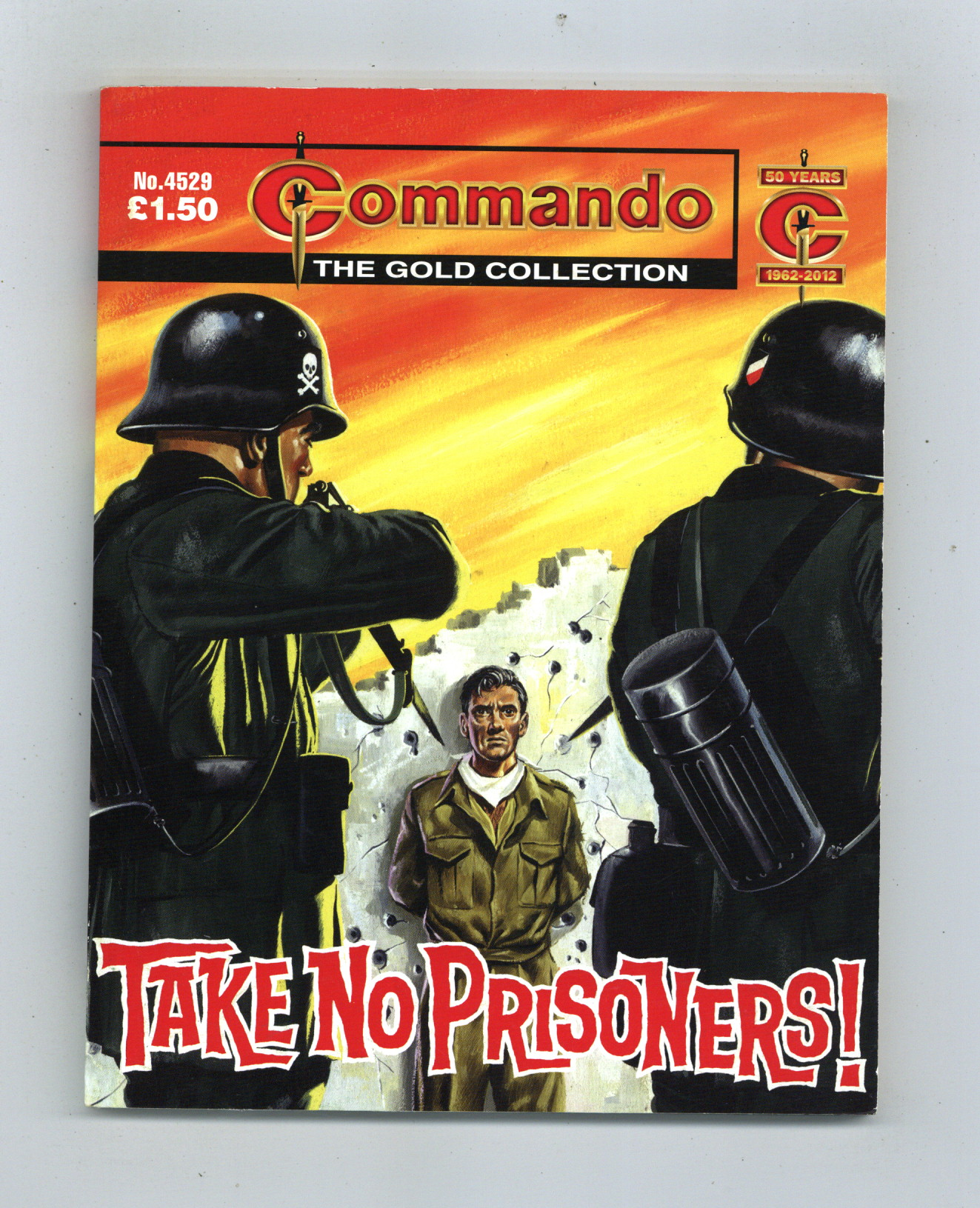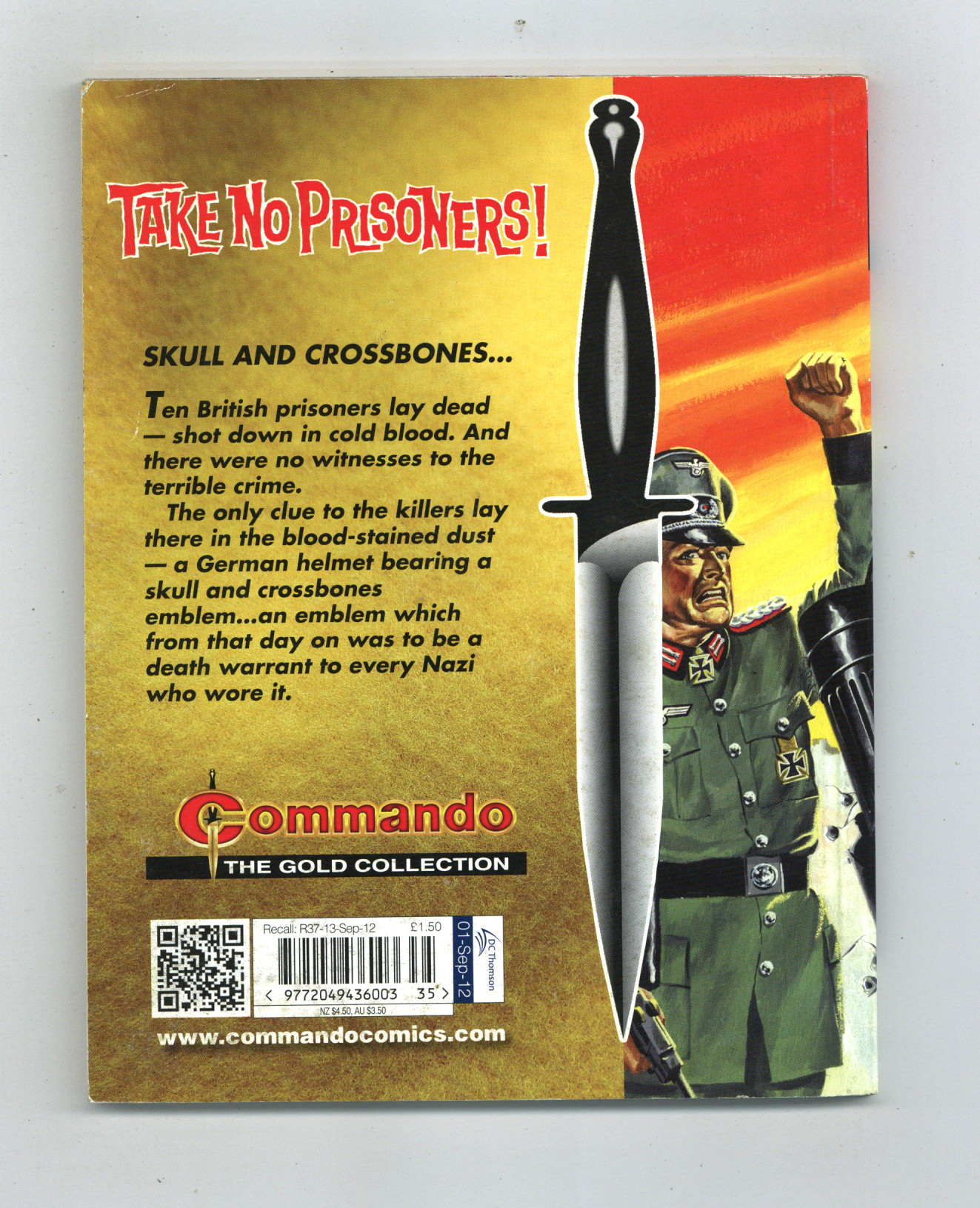 Published Sep 2012 by D. C. Thomson & Co..$8.49Reprinting Commando War Stories in Pictures (1961 D. C. Thomson Digest) #25: Take No Prisoners! - Written by Eric Hebden. Art by Casarubio. Cover by Ken Barr. Ten British prisoners lay dead -- shot down in cold blood. And there were no witnesses to the terrible crime. The only clue to the killers lay there in the blood-stained dust -- a German helmet bearing a skull and crossbones emblem...an emblem which from that day on was to be a death warrant to every Nazi who wore it. Weekly British War comics digest. Softcover, 5 1/2-in. x 6 1/2-in., 68 pages, B&W.