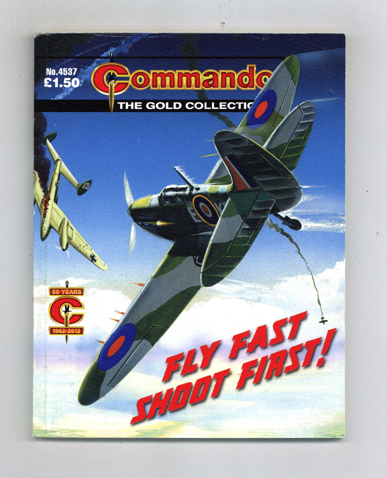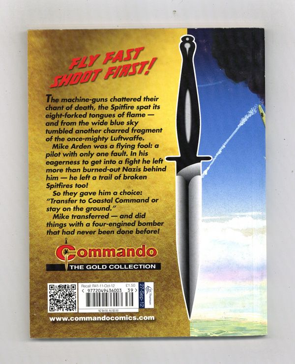 Published Sep 2012 by D. C. Thomson & Co..$8.00Reprinting Commando War Stories in Pictures (1961 D. C. Thomson Digest) #14: Fly Fast Shoot First! - Story and Art by Peter Ford. Cover by Ken Barr. The machine-guns chattered their chant of death, the Spitfire spat its eight-forked tongues of flame...and from the wide blue sky tumbled another charred fragment of the once-mighty Luftwaffe. Mike Arden was a flying fool: A pilot with only one fault. In his eagerness to get into a fight, he left more than burned-out Nazis behind him -- he left a trail of broken Spitfires, too! So they gave him a choice: "Transfer to Coastal Command or stay on the ground." Mike transferred...and did things with a four-engined bomber that had never been done before! Weekly British War comics digest. Softcover, 5 1/2-in. x 6 1/2-in., 68 pages, B&W.