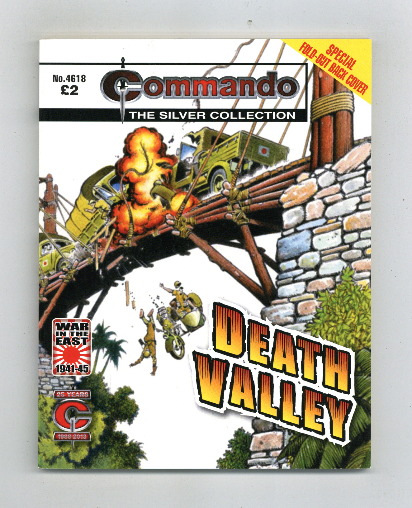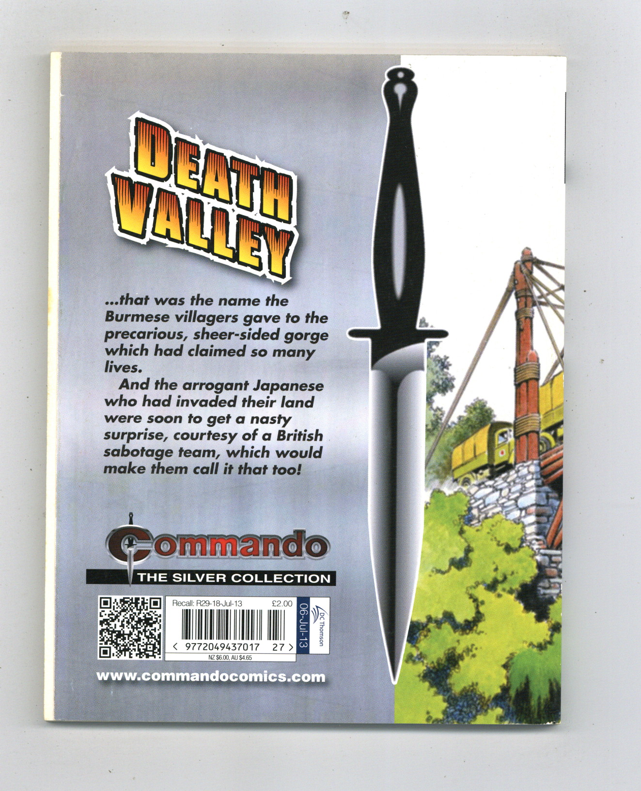 Reprinting Commando War Stories in Pictures (1961 D. C. Thomson Digest) #2215: Death Valley - Written by Allan Chalmers. Art by Ibanez. Cover by Jeff Bevan. "Death Valley" was the name the Burmese villagers gave to the precarious, sheer-sided gorge which had claimed so many lives. And the arrogant Japanese who had invaded their land were soon to get a nasty surprise, courtesy of a British sabotage team, which would make them call it that, too! Weekly British War comics digest. Softcover, 5 1/2-in. x 6 1/2-in., 68 pages, B&W.