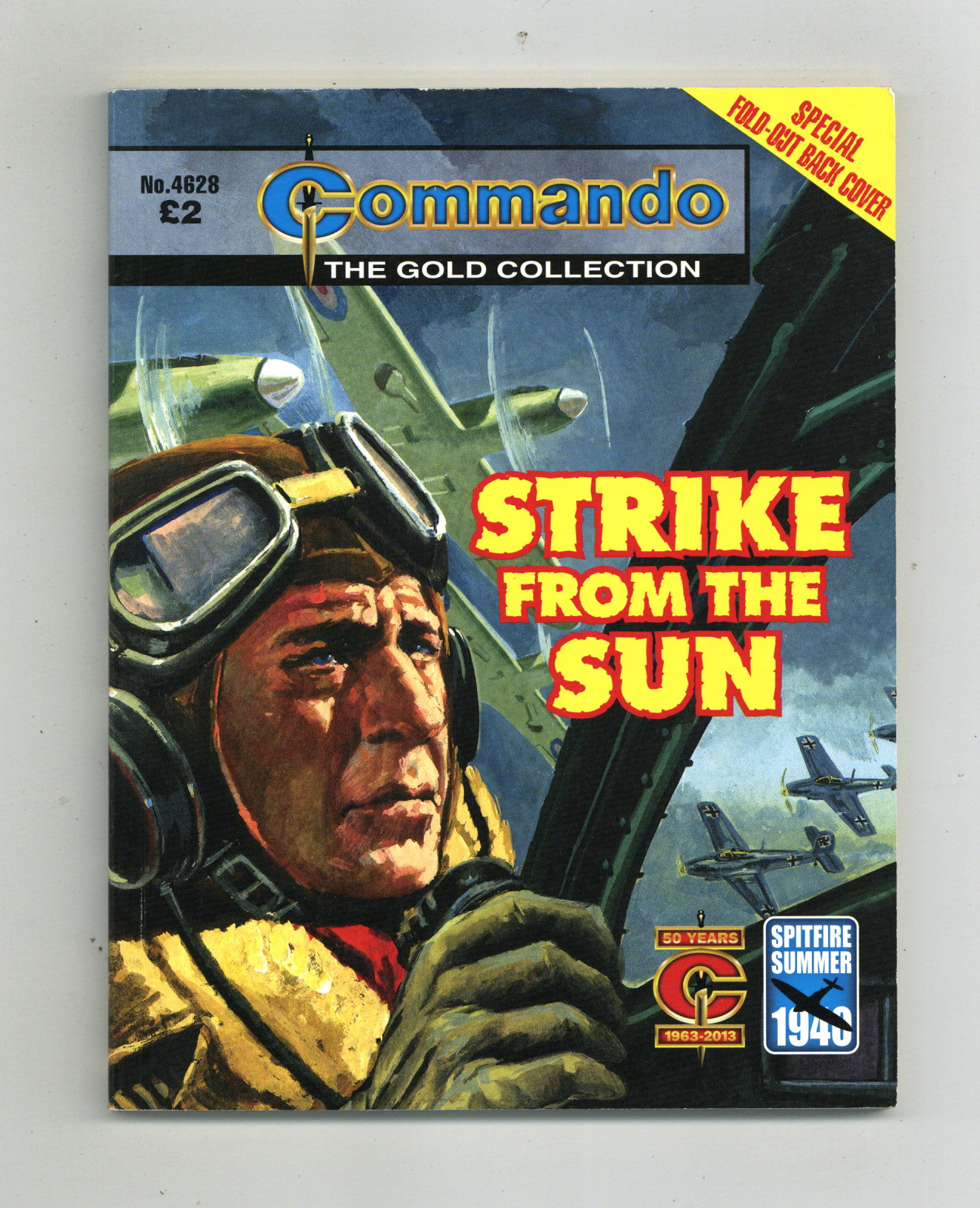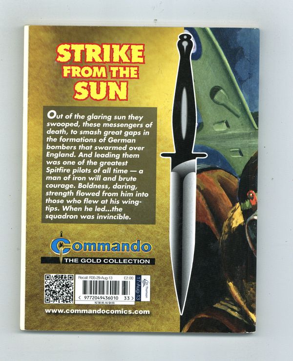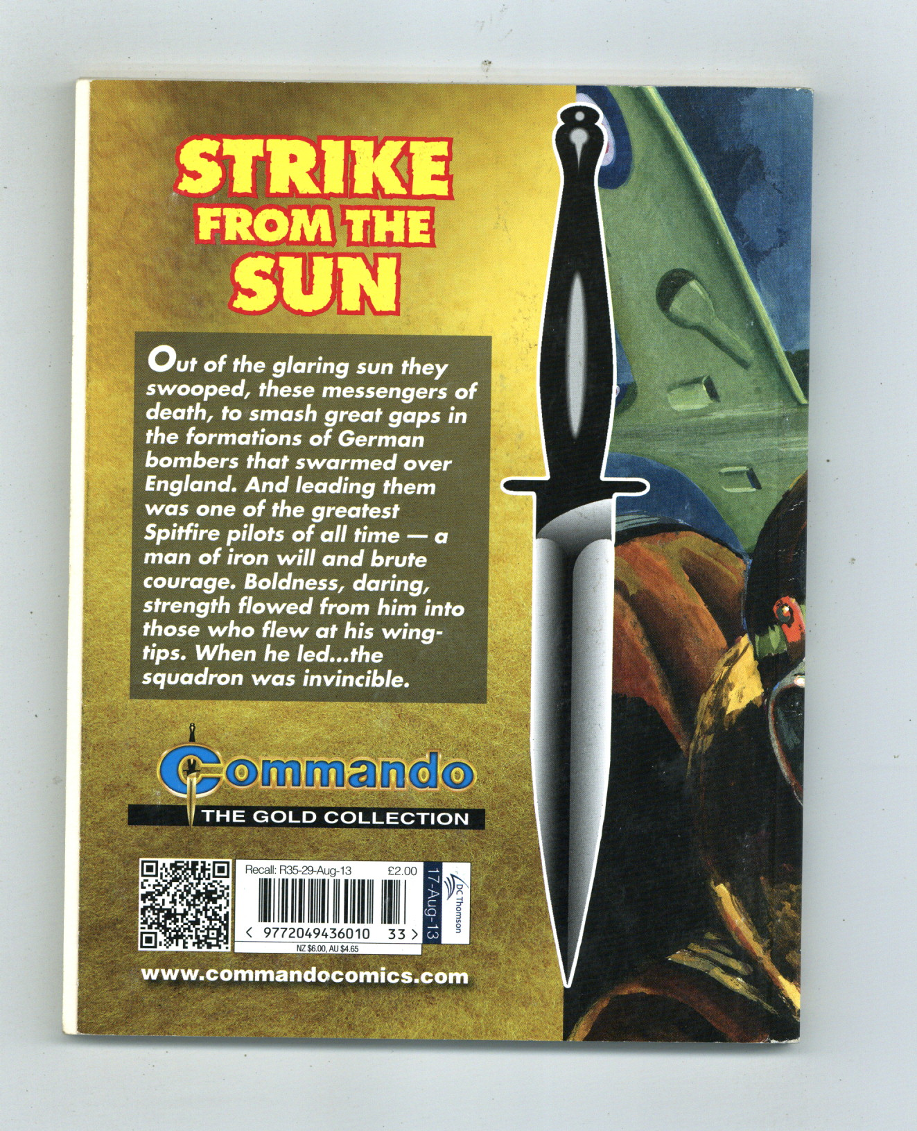 Reprinting Commando War Stories in Pictures (1961 D. C. Thomson Digest) #64: Strike from the Sun - Written by Roger Clegg. Art by Peter Ford. Cover by Ferraz. Out of the glaring sun they swooped, these messengers of death, to smash great gaps in the formations of German bombers that swarmed over England. And leading them was one of the greatest Spitfire pilots of all time -- a man of iron will and brute courage. Boldness, daring and strength flowed from him into those who flew at his wing-tips. When he led...the squadron was invincible. Weekly British War comics digest. Softcover, 5 1/2-in. x 6 1/2-in., 68 pages, B&W.