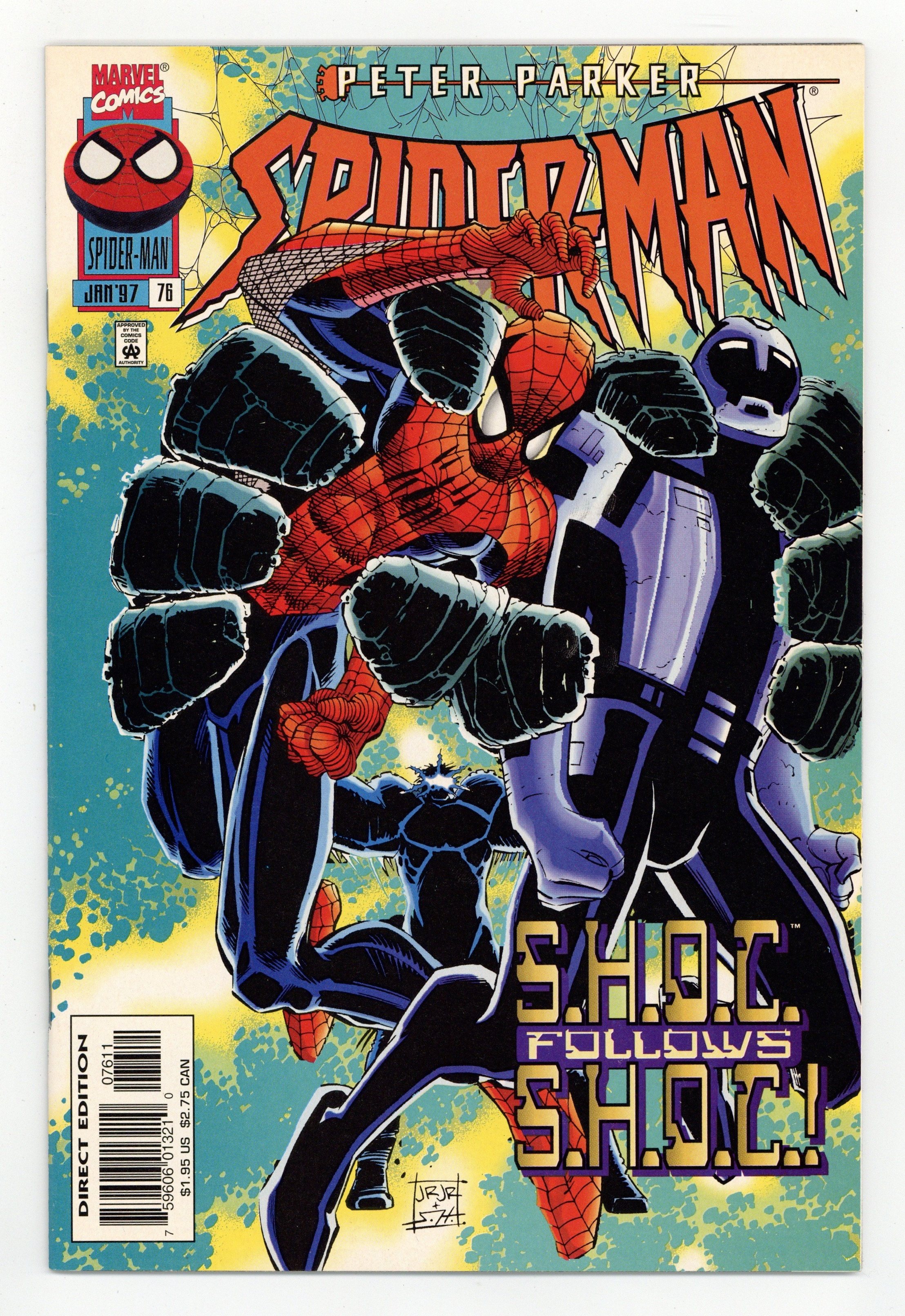 Tags: Spider-Man$17.50"S.H.O.C." Script by Howard Mackie. Pencils by John Romita Jr. Inks by Scott Hanna. Cover by John Romita Jr. and Scott Hanna. The second clone saga is over and a new chapter begins today in the lives of the Amazing Spider-Man and his beautiful wife! Both Mary Jane and Peter are on their way to Empire State University to start new endeavors! When MJ signs up for classes she meets a new friend: Jill Stacy... the cousin of the late Gwen Stacy! In the meantime across campus; while trying to locate a research professor, Peter runs into a new superhero and a new super-villain! Who are Crown and SHOC? And where did they come from? The questions must wait as the Spectacular Spider-Man's first priority is shutting off an experimental energy generator that threatens to destroy the ESU campus! Welcome back to school Mr. and Mrs. Parker! First appearances of Crown, SHOC, and Jill Stacy. Cameo appearances by Flash Thompson, Betty Brant, J. Jonah Jameson, and Anna Watson. (Note: This issue includes a 3-page preview of the upcoming "Devil's Reign" collaboration between Top Cow Productions and Marvel Comics.) 40 pages. Cover price $1.95.